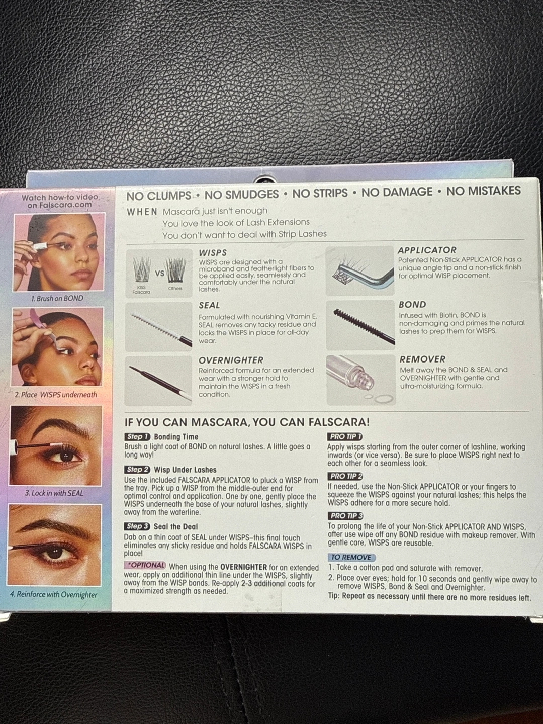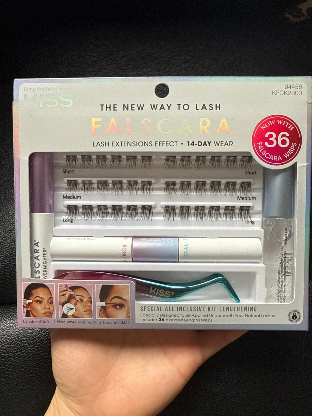New KISS Falscara Lash Extensions Kit. Includes 36 wisps in short, medium, and long lengths. Application tools and sealant included. 14-day wear.