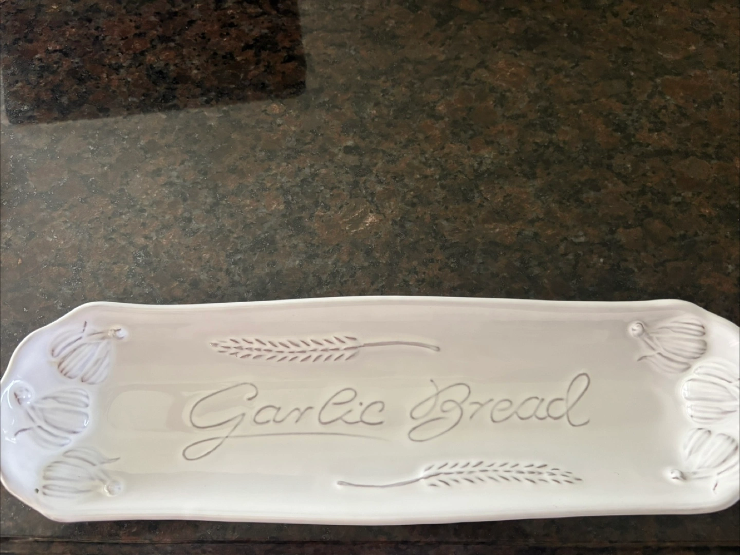 New never used garlic bread motif platter. Made in Portugal. 14” x 4 1/4”.