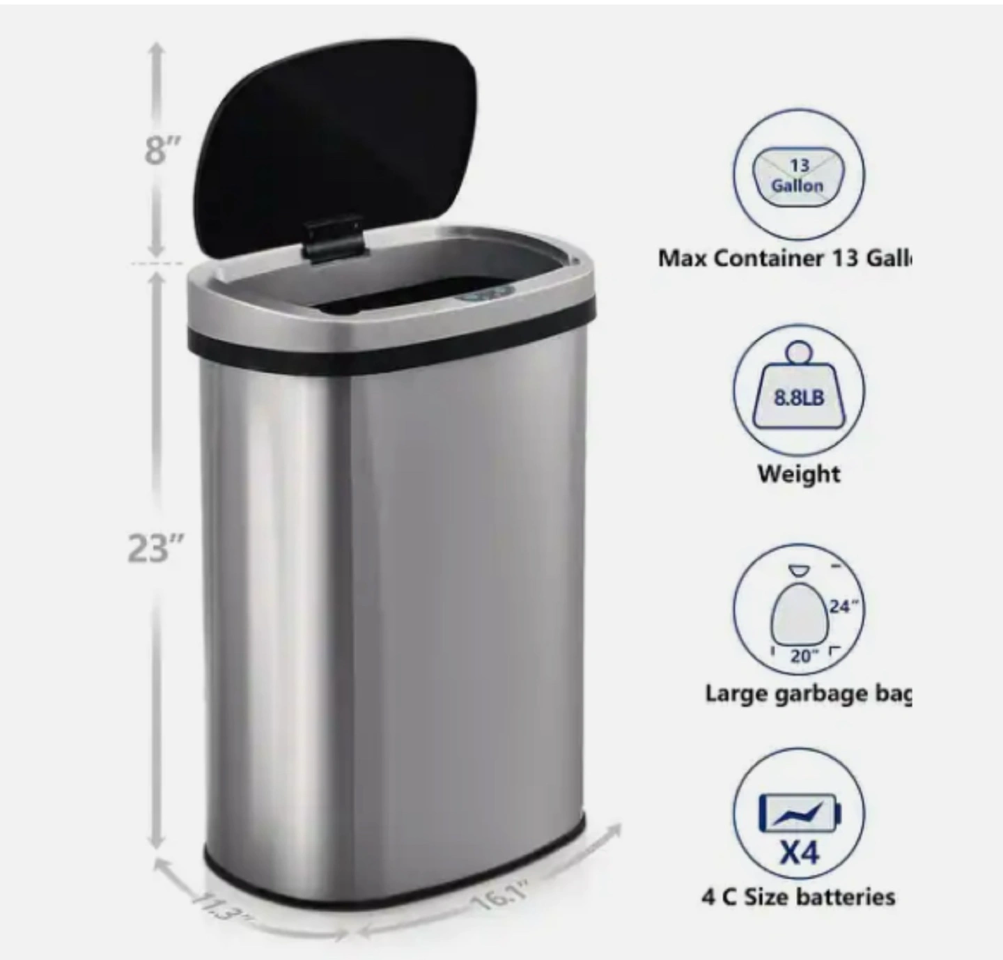 EFFICIENT SPACE & MONEY SAVER – Oval shape fits snugly in corners, accommodating common kitchen garbage can 13 gallon trash bags, saving you money with this sensor trash can. Dimensions: 11.4 inch Length x 16 inch Width x 25.3 inch Height.
