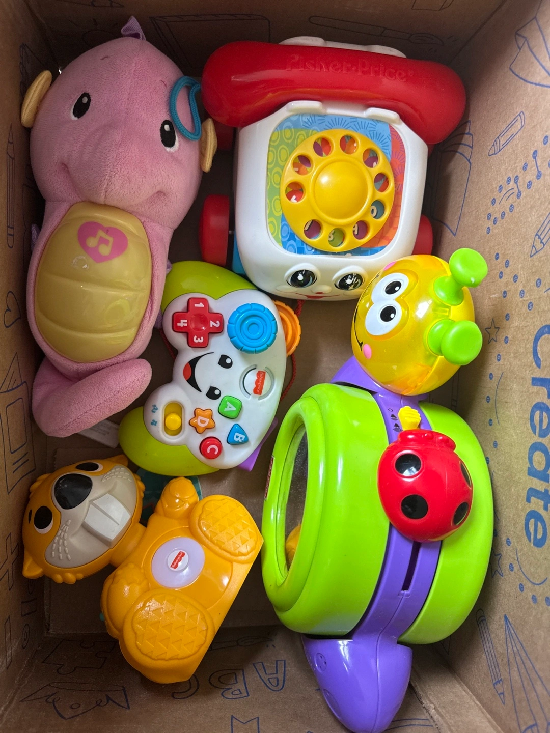 Several baby toys included. Features plush seahorse, chatter phone, Laugh and Learn Controller Green Pretend Video Game with Music, Crawl-Along Snail, and more. Gently used.