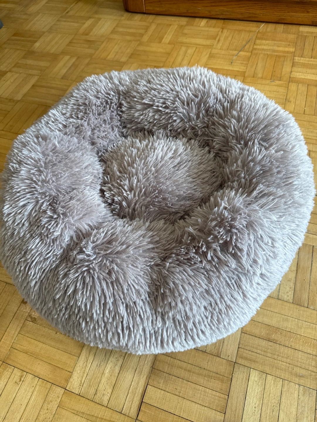 Round pet bed. Soft, fluffy material. Perfect for small to medium-sized pets. Machine washable.