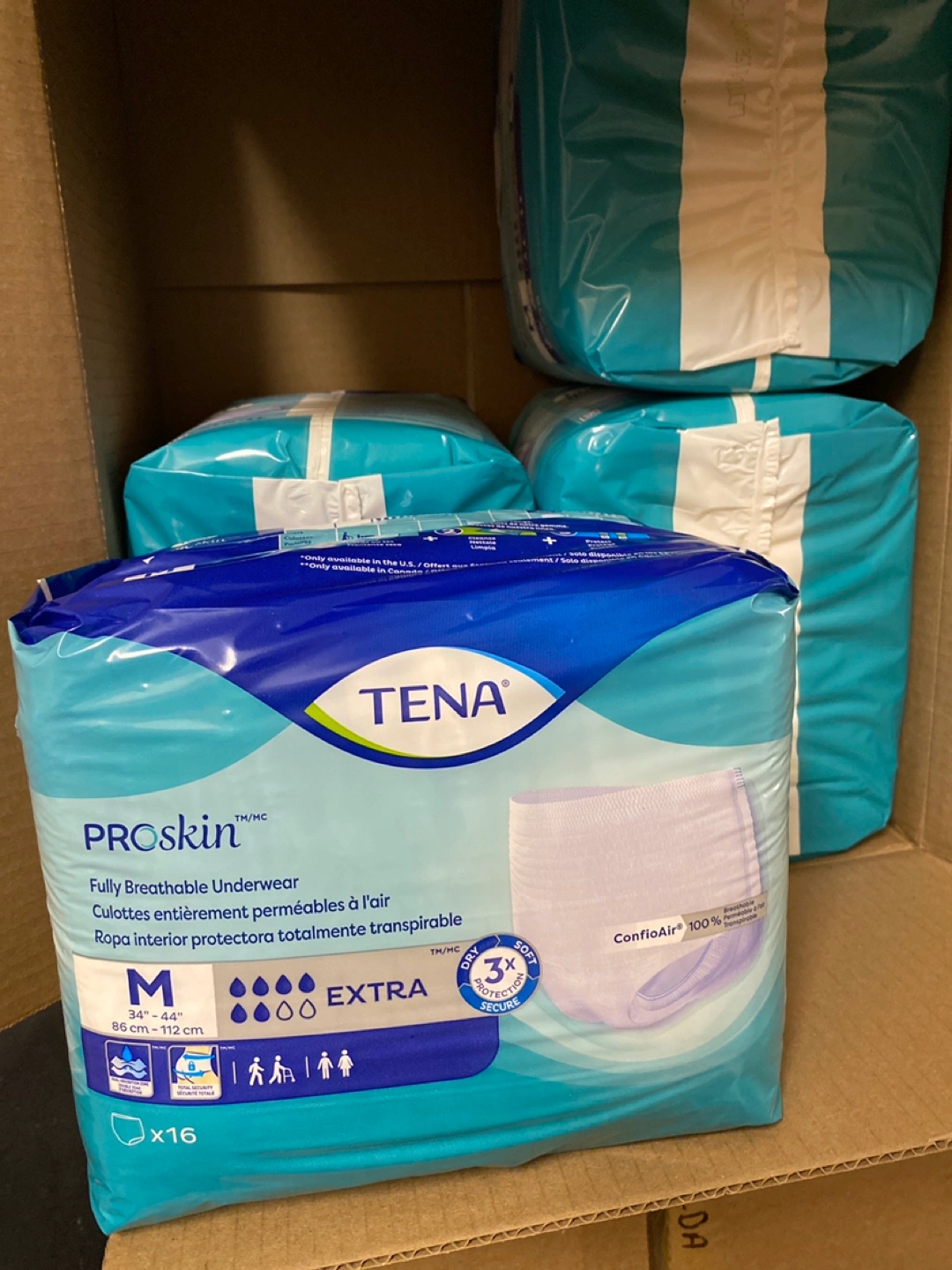 Bulk package of TENA ProSkin fully breathable underwear. Size Medium, extra absorbency. 16 pairs per package. Good for incontinence. 4 packs