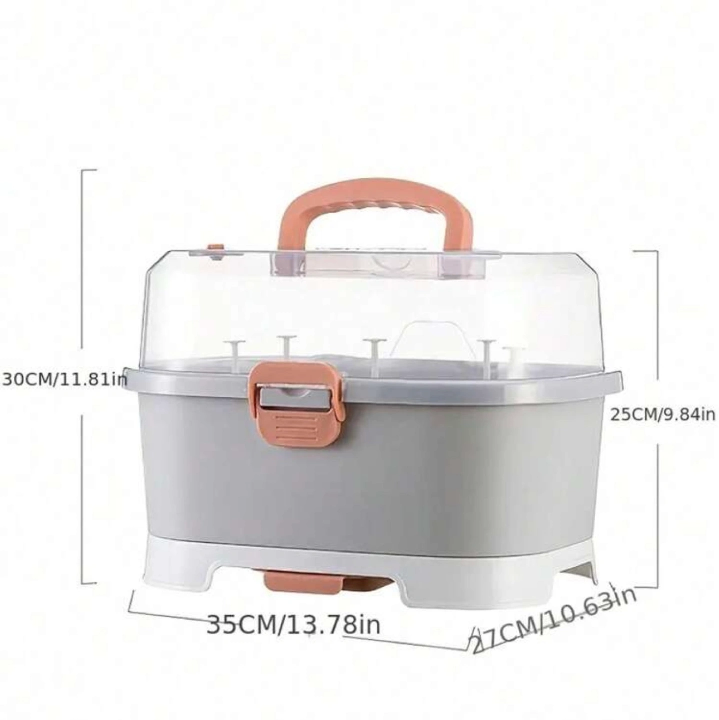 Portable bottle drying rack. BPA-free plastic. Large capacity. Includes bottle holders and drying rack. Top lid for dust protection. Easy to clean. New in the box, grey and pink
