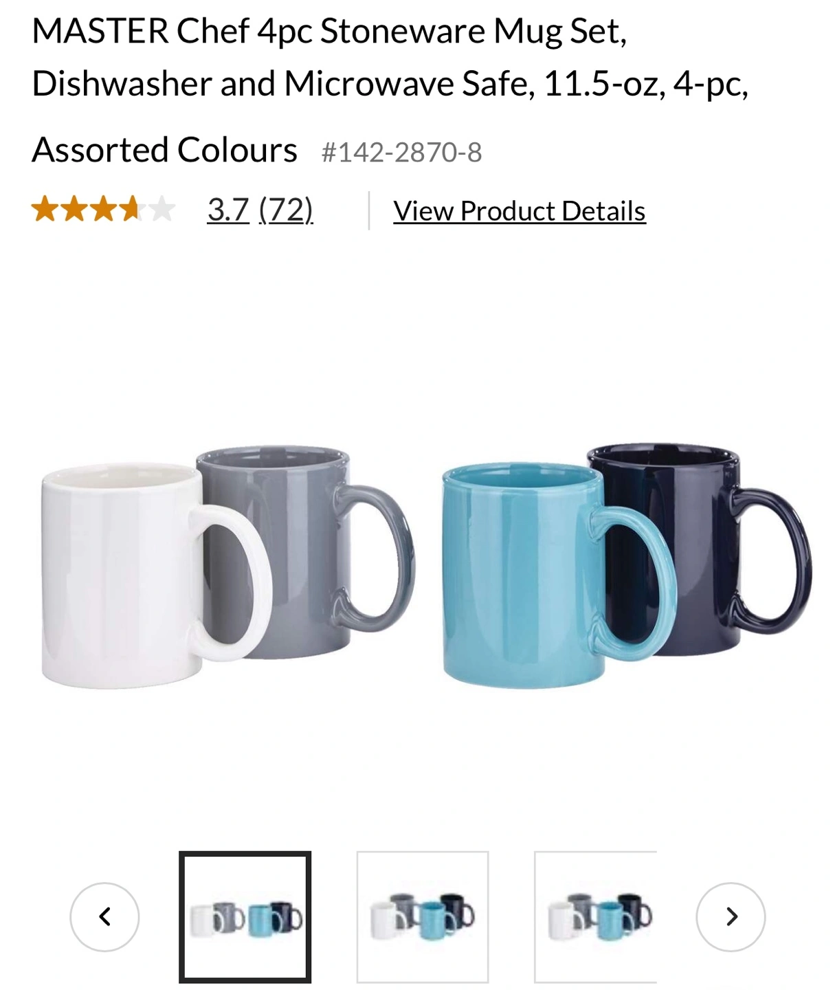 Stoneware mug set. Dishwasher and microwave safe. 11.5-oz mugs. Four pieces. Assorted colours.