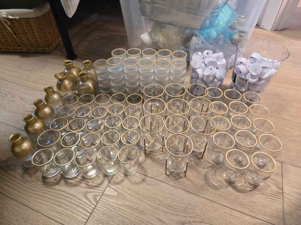 Set of gold glass vases, small gold-rimmed glasses, and tea light holders. Includes many white tea lights. Perfect for weddings, parties, or home decor.
