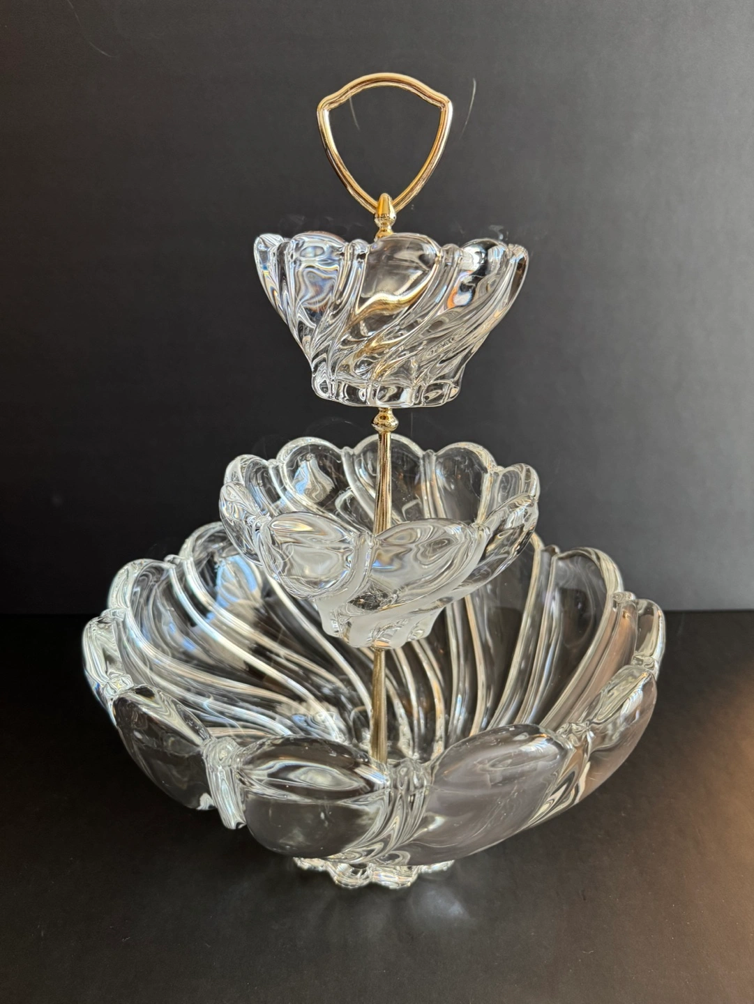 Vintage three-tiered crystal serving bowl. Features a gold-toned metal stand and swirling glass design. Perfect for snacks, desserts, or candies.High 14 inches, diameter 10-5.5-4 inch