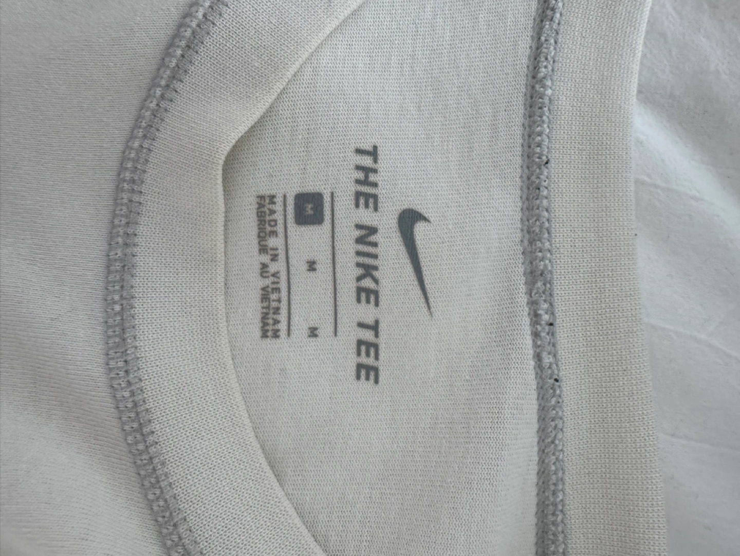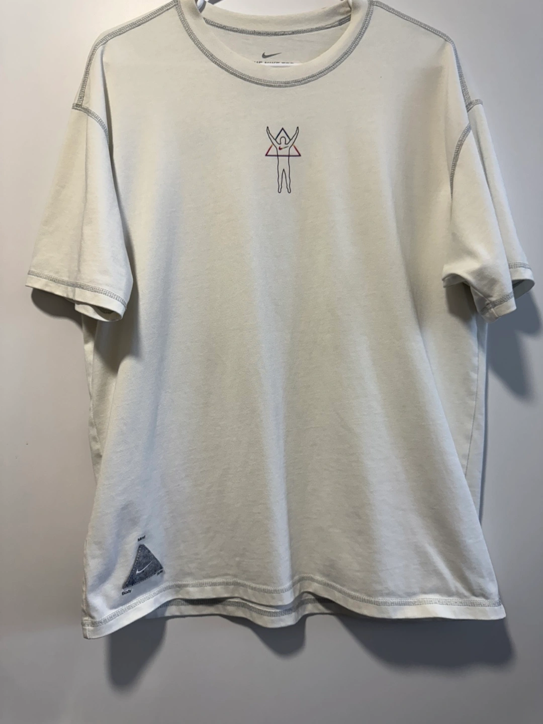 Cream-coloured men's medium Nike T-shirt. Features unique graphic design on the back and small graphic on the front.. Short sleeves, crew neck.