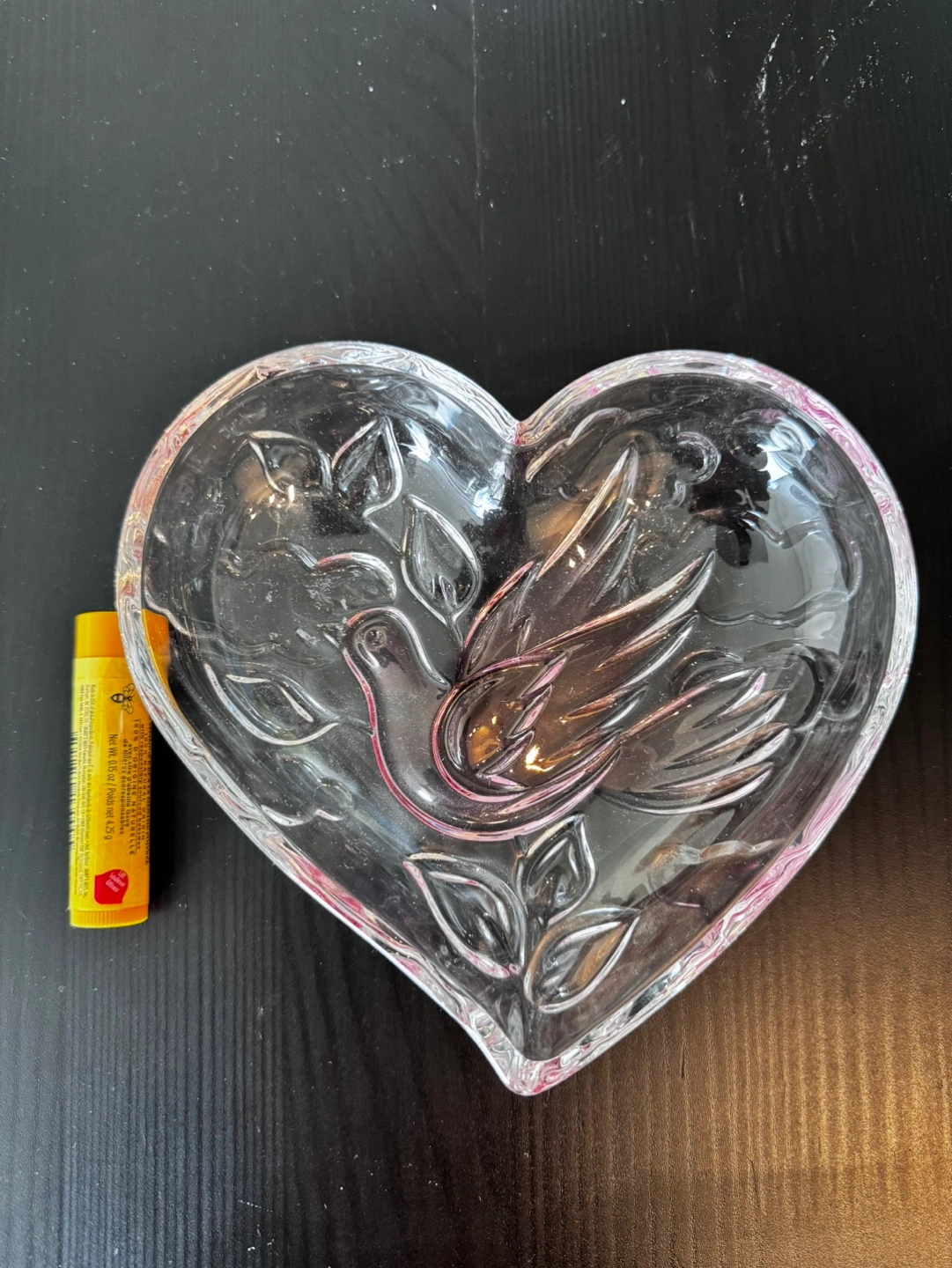 Lovely clear crystal dish. Heart-shaped with a dove and leaf design.