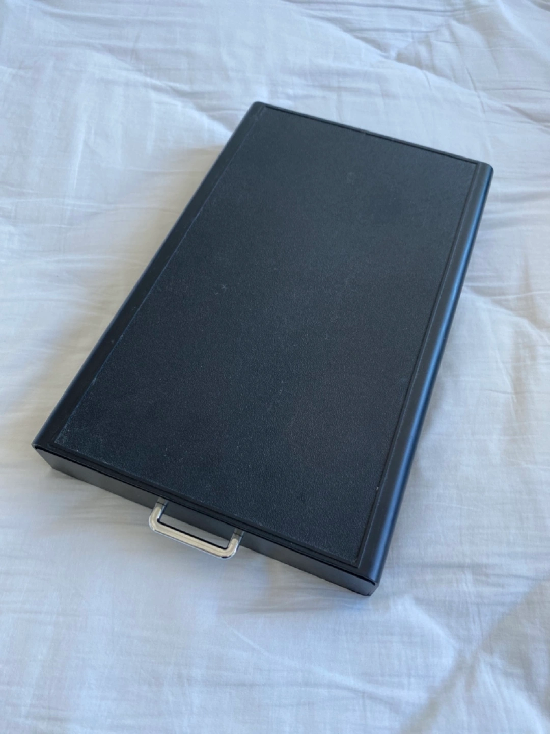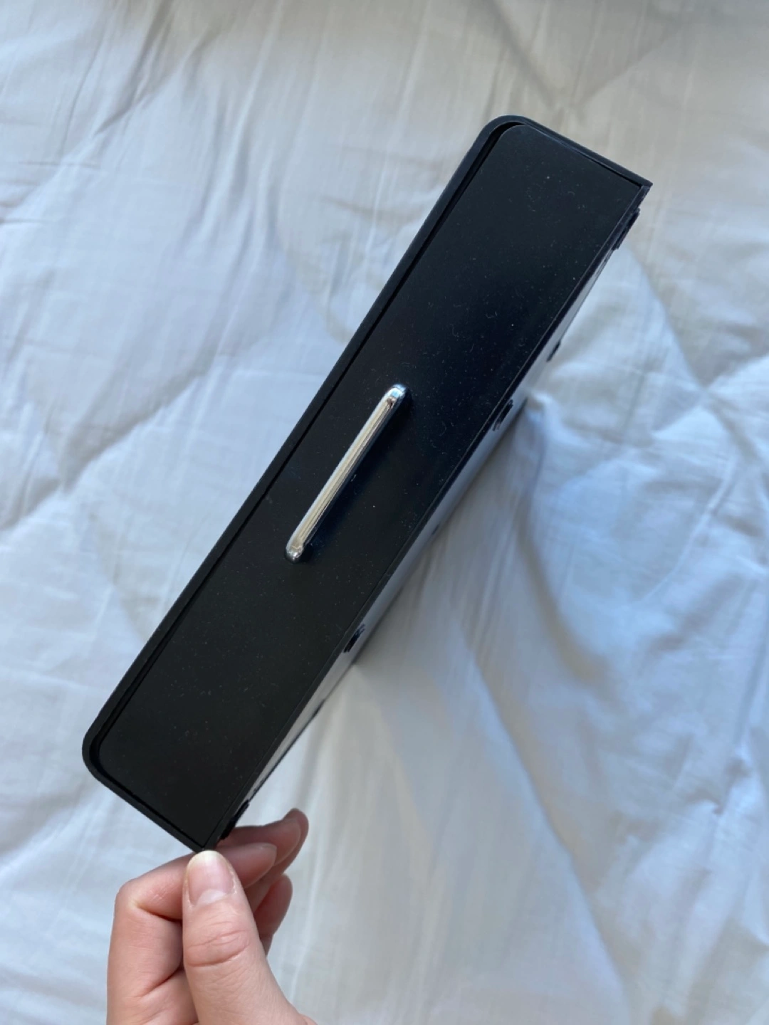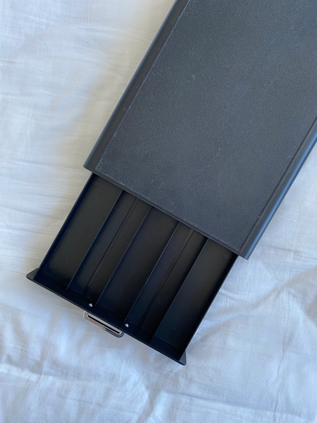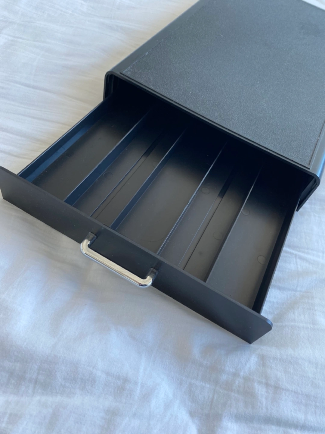 Amazon Basic black plastic organizer for Nespresso pods. Slide-out drawer. Holds approximately 50 pods. Great for keeping your coffee organized.