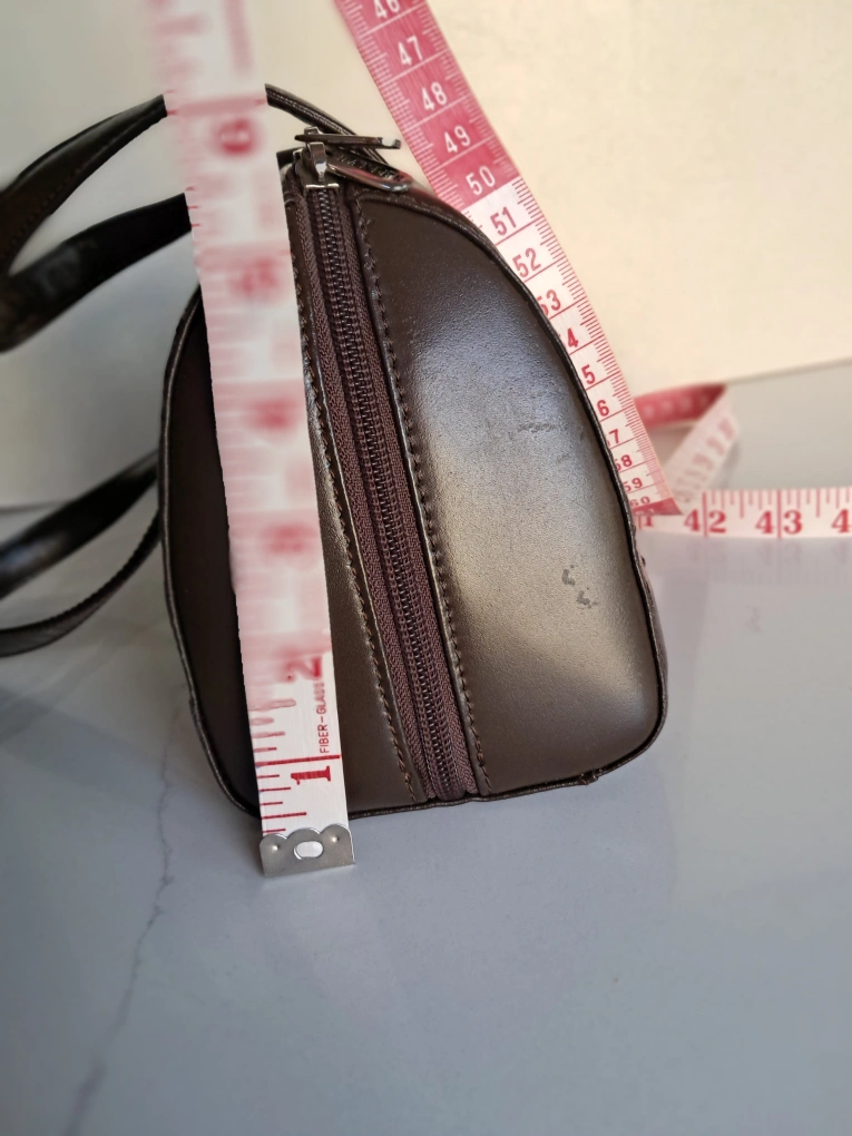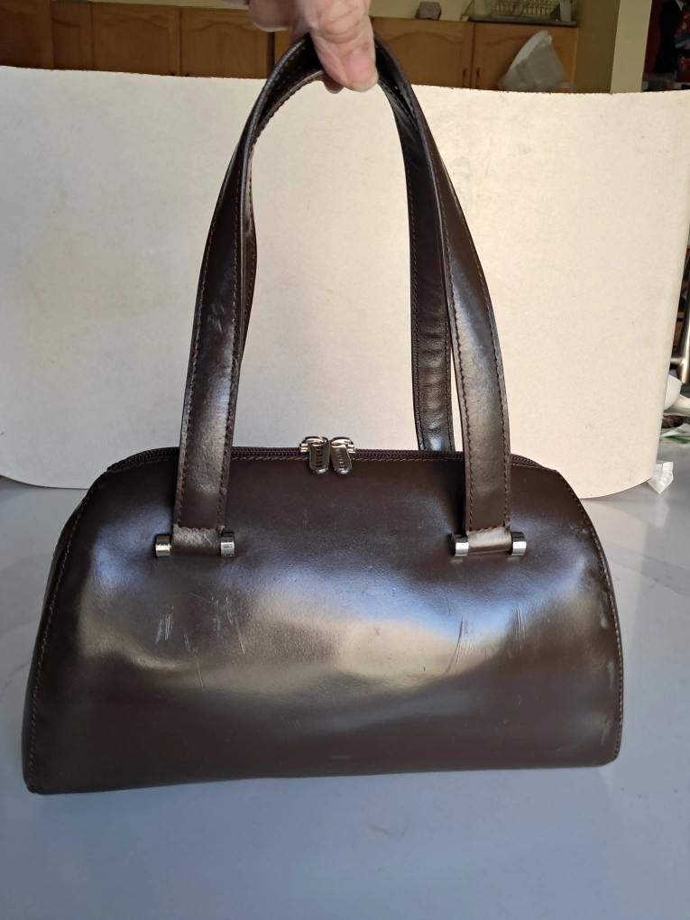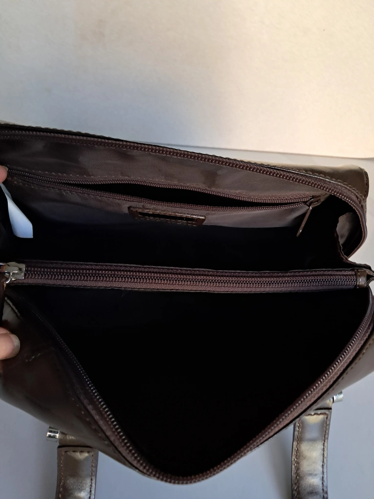 Brown leather handbag. Top zip closure. Two handles. Interior center divider zippered pocket and zippered side pocket. Made of Italian leather.