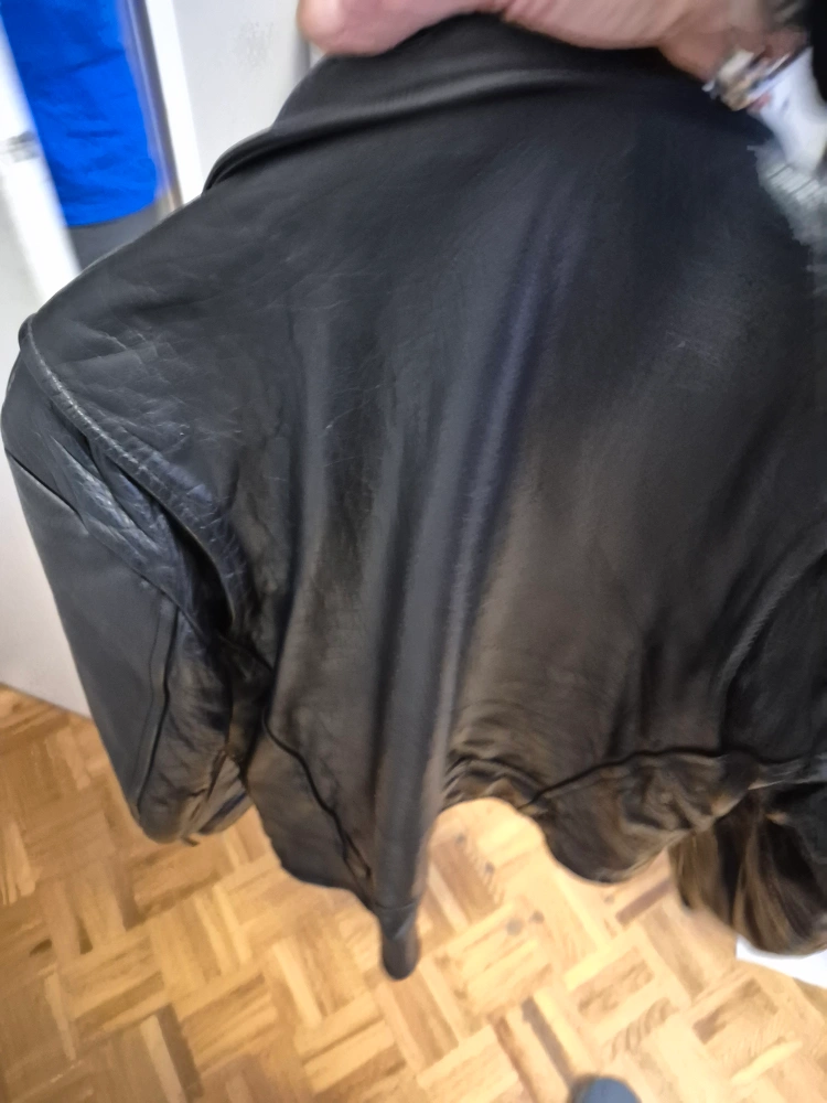 Black leather jacket. Classic biker style. Zipper closure. Multiple pockets. Good condition.