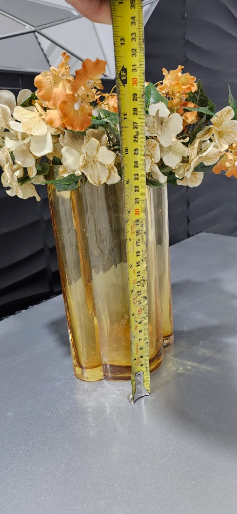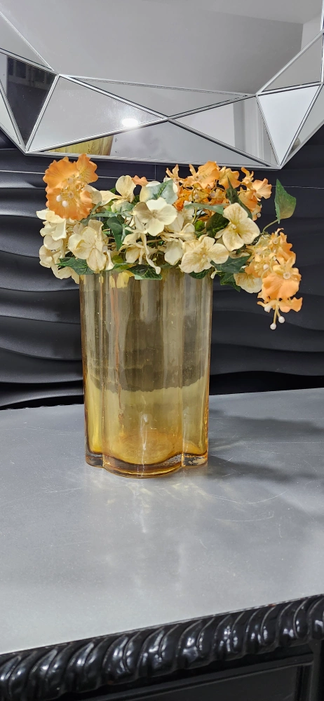 Tall amber glass vase. Faceted design. Approximately 12 inches tall. Perfect for displaying flowers or other décor. Unique shape and colour.