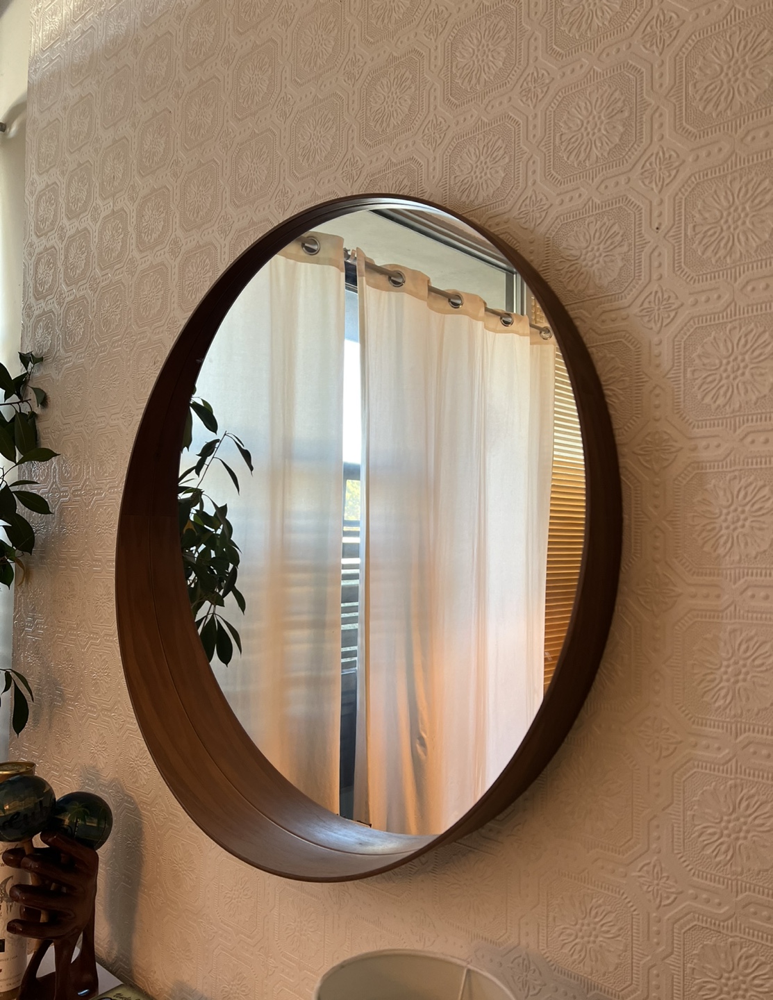 Large round mirror with walnut veneer frame. Stylish and modern design. Perfect for entryway or bedroom.