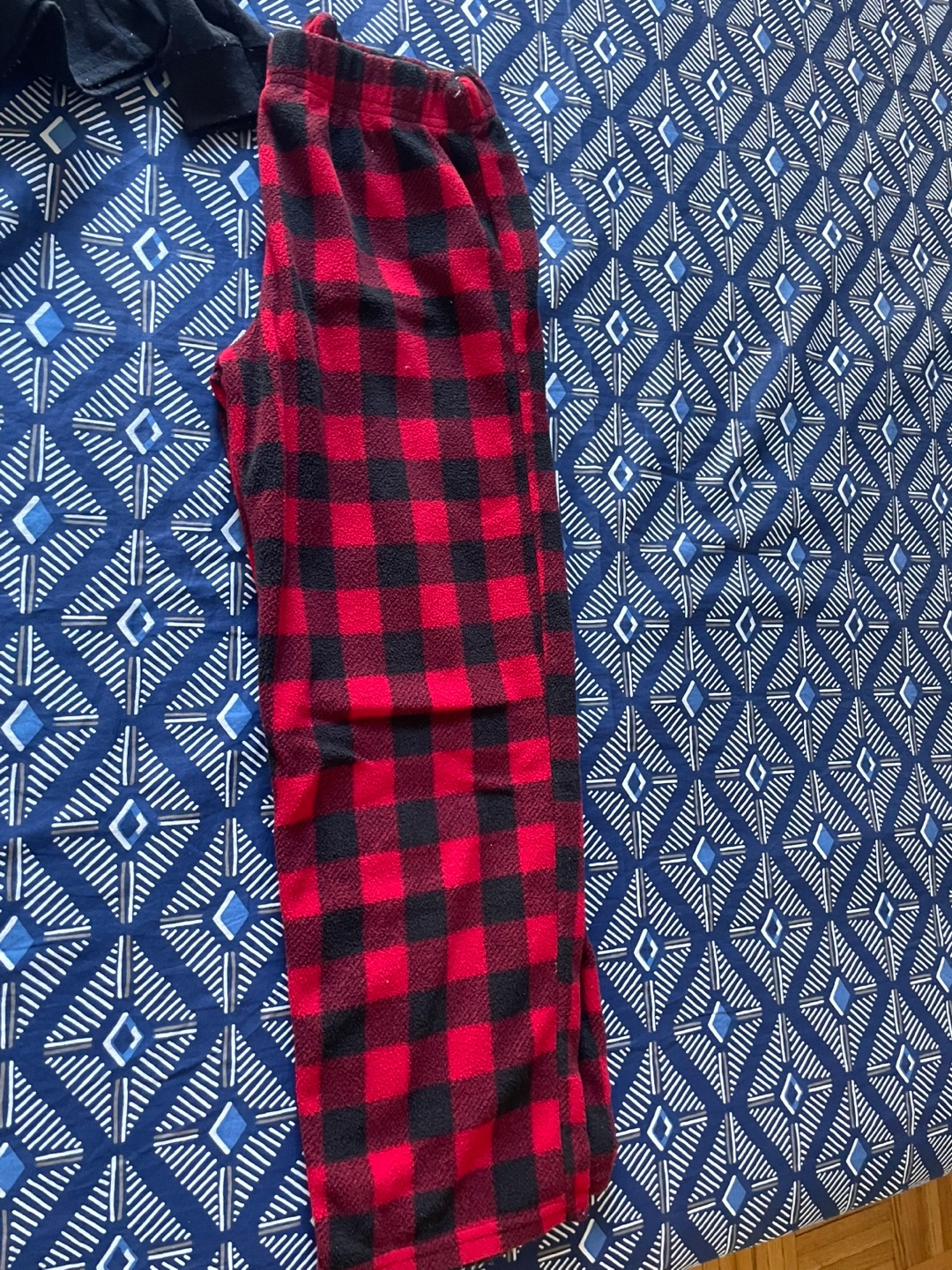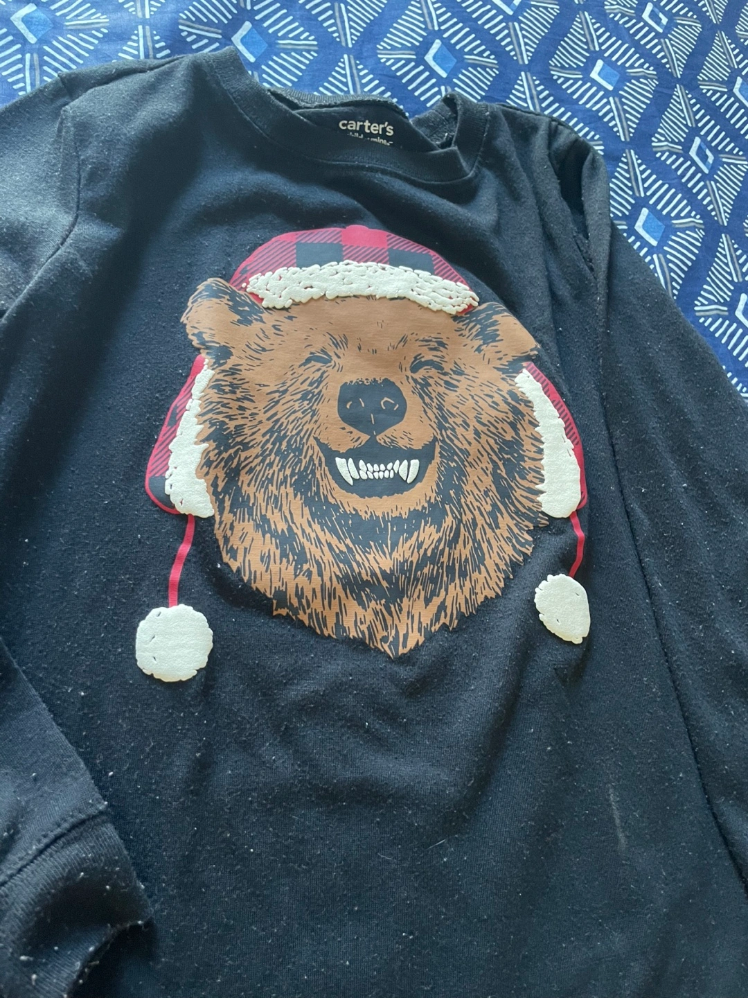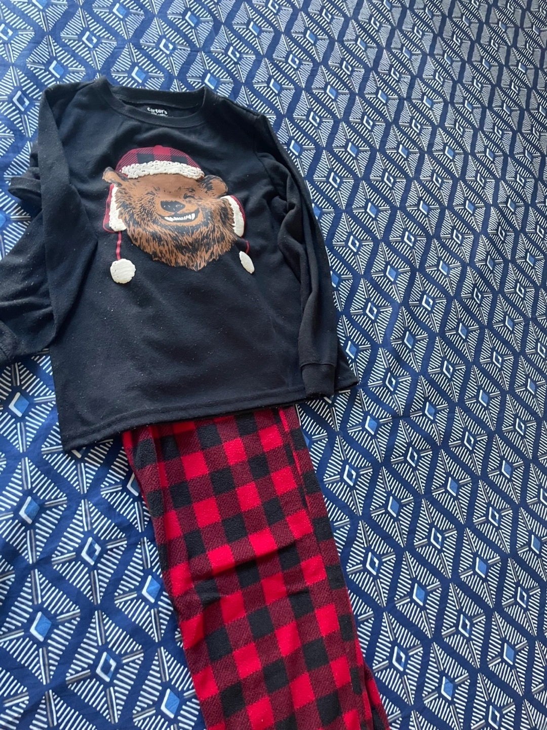 Carter's boys' size 8 Christmas pajamas. Long-sleeved black top features a bear wearing a Santa hat. Red and black plaid bottoms. Cozy and festive.