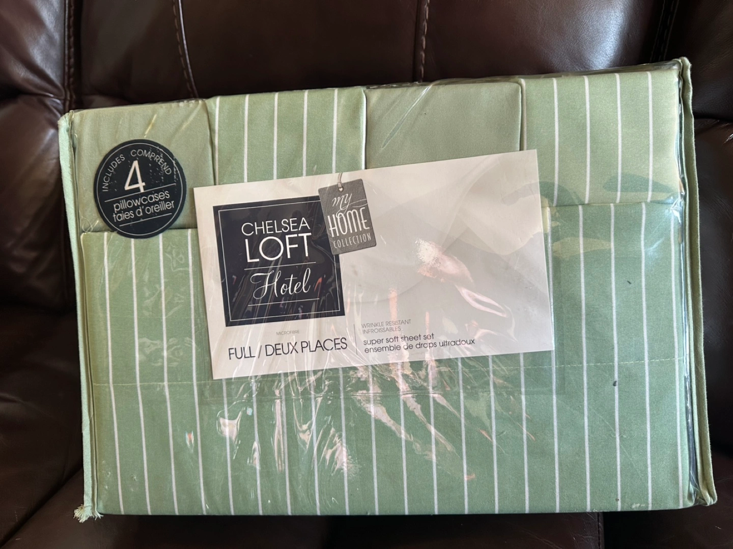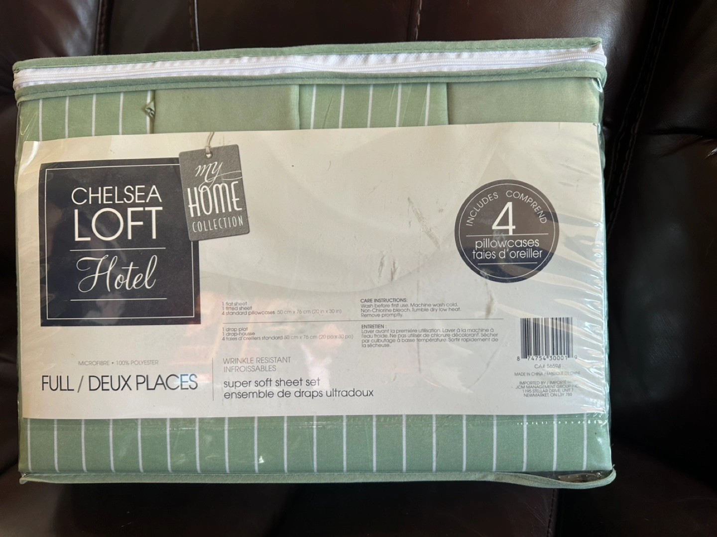 1000+New full-size sheet set. Sage green with white pinstripes. Includes four pillowcases. Microfibre, wrinkle resistant. Super soft. Pay by cash please