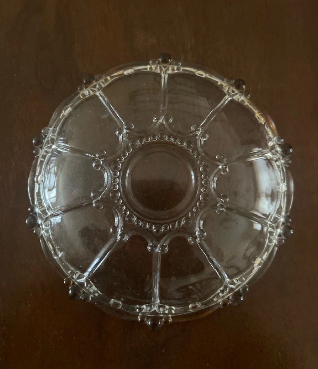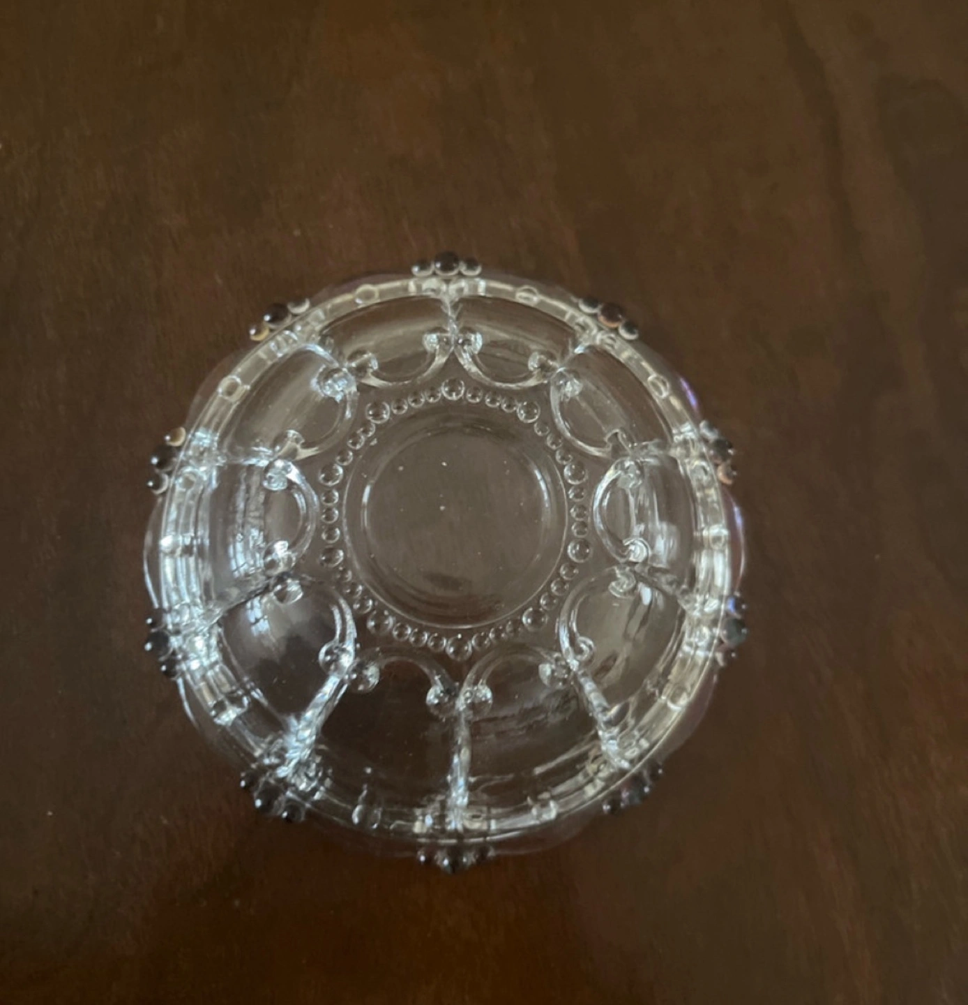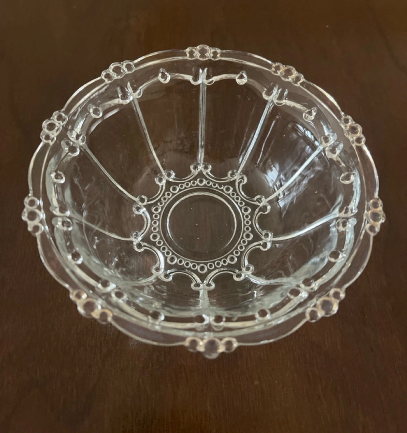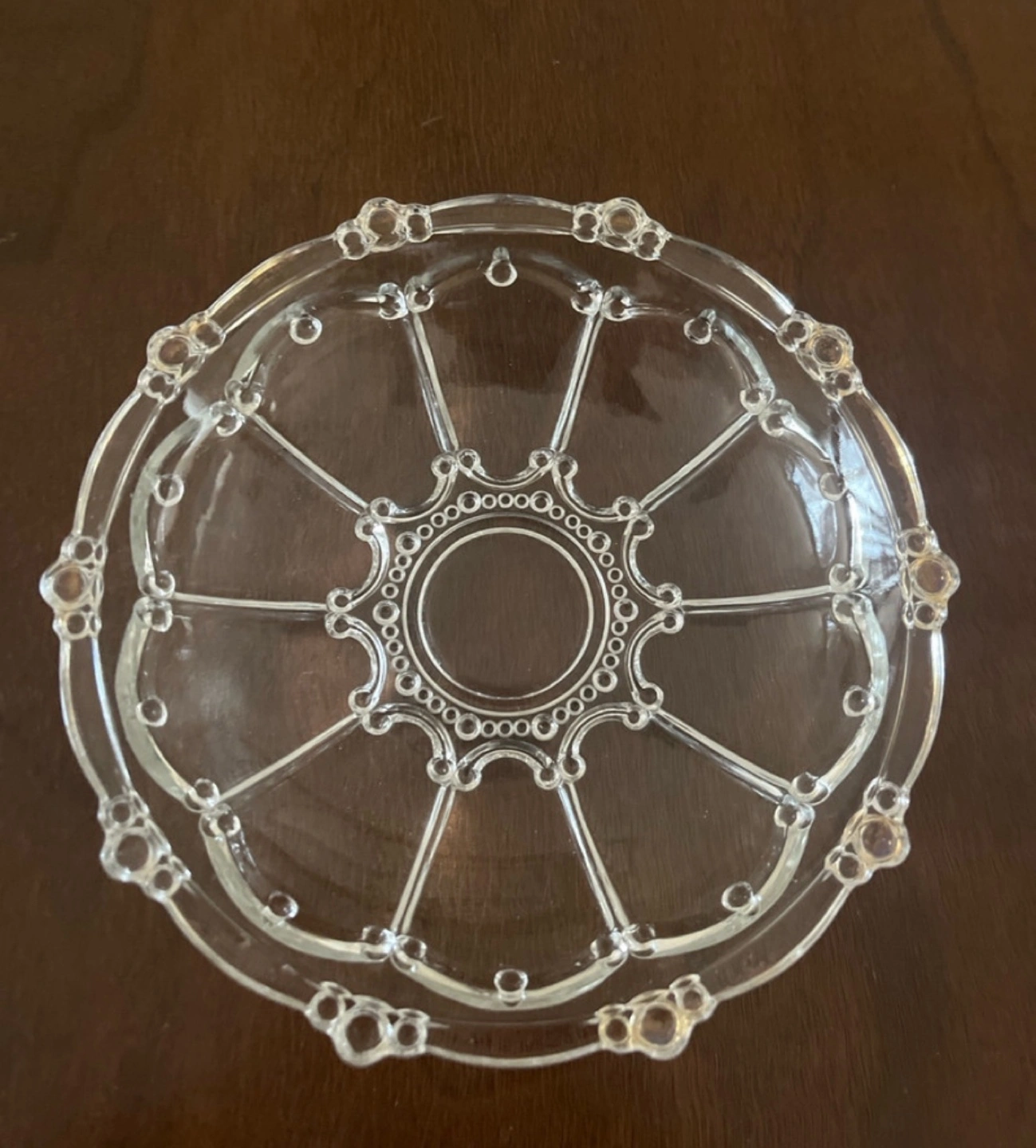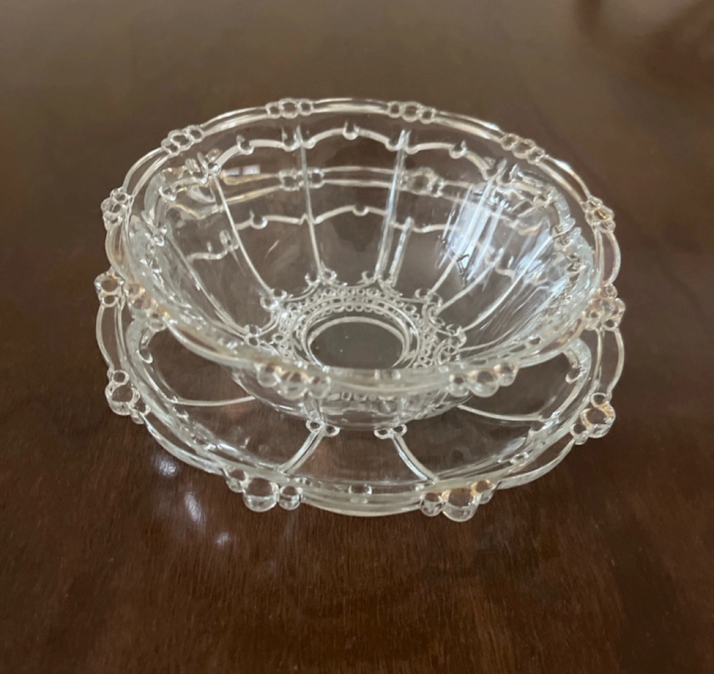 68Ornate glass bowl and matching plate. Clear glass with decorative detailing. Perfect for candies or trinkets. Small size.