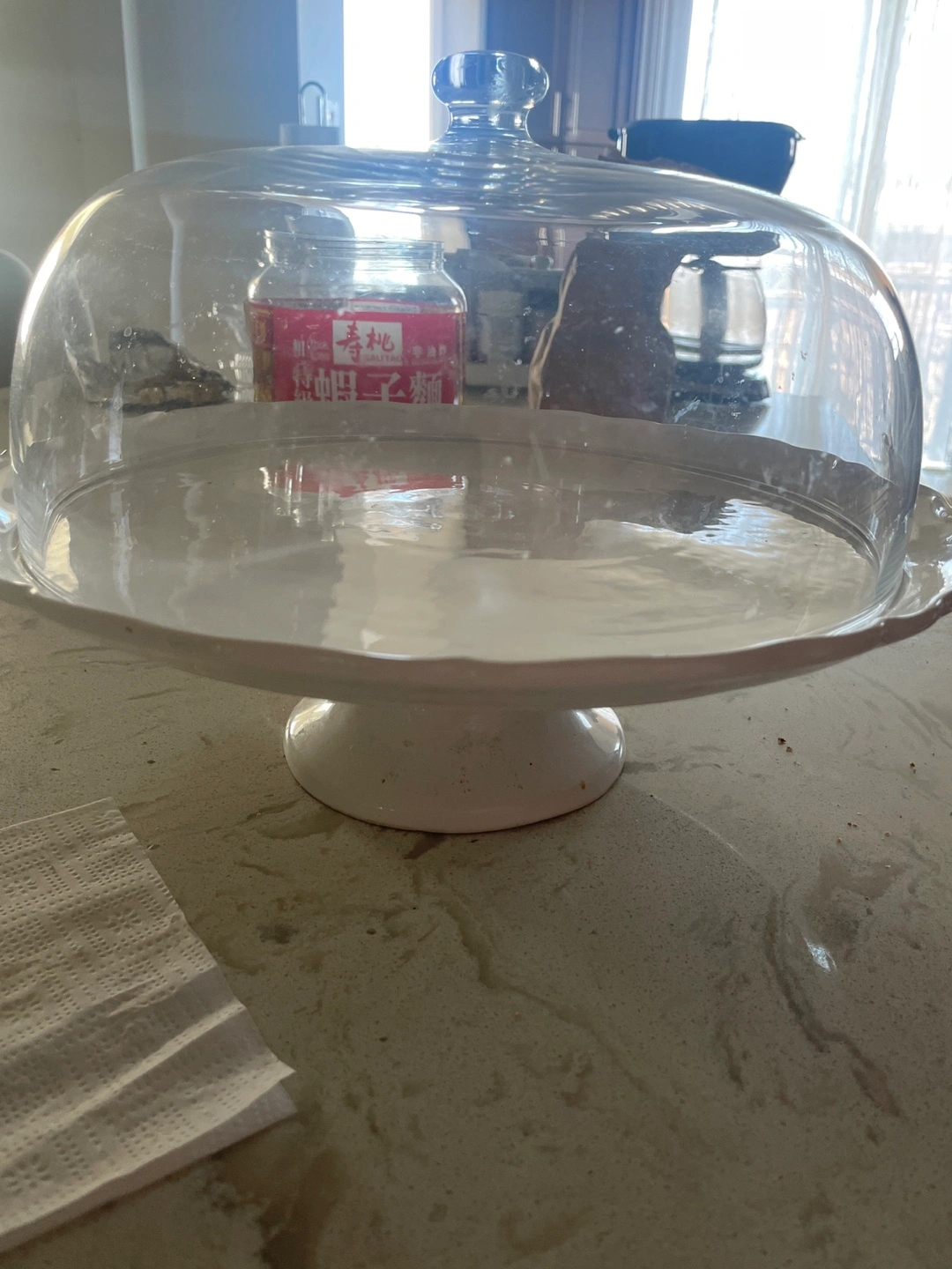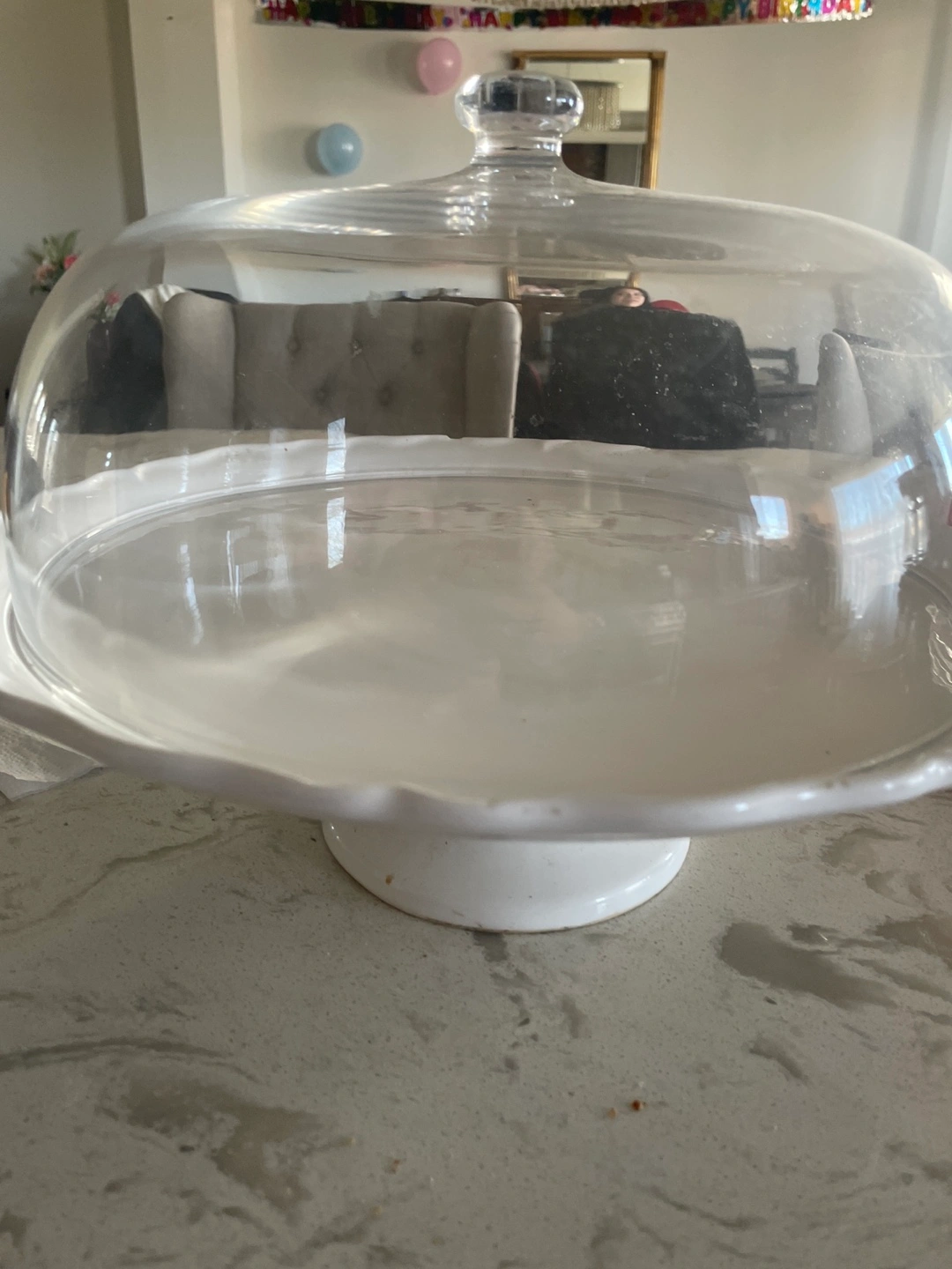 552Elegant white ceramic cake stand. Features a glass dome cover. Perfect for displaying cakes, pastries, or desserts. Pedestal base. Stylish addition to any kitchen.