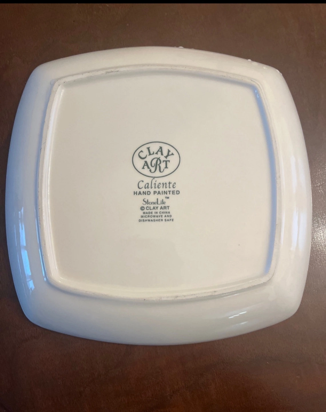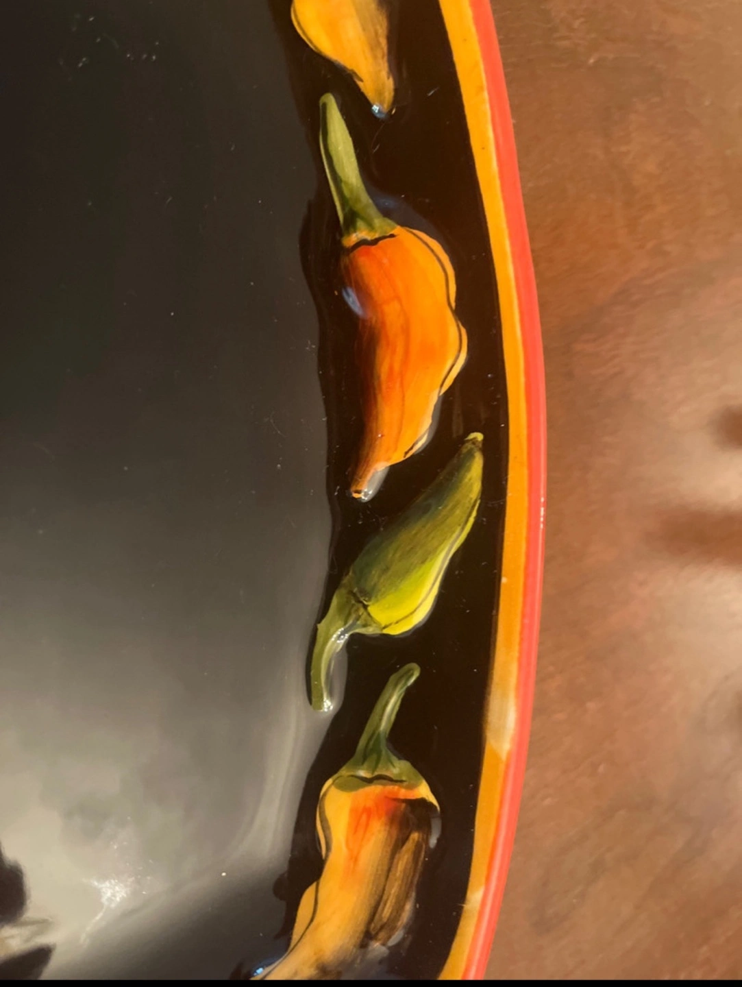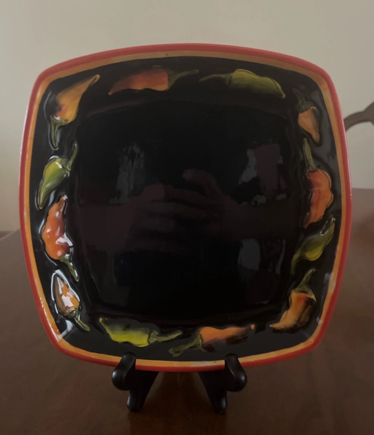 Square decorative plate. Features hand-painted chili peppers. Black background with red and orange accents. StoneLite material. Microwave and dishwasher safe.