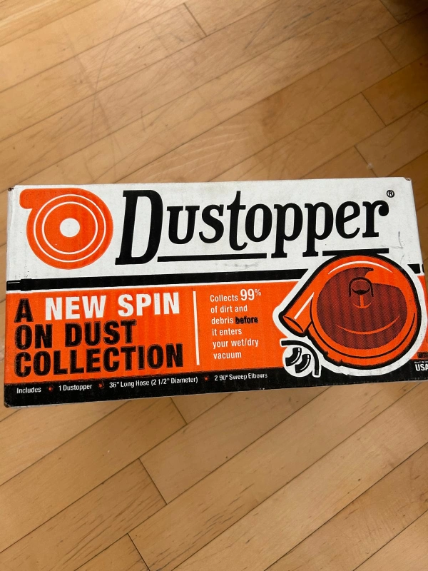 New in box vintage Duststopper dust collection system. Includes 36" hose and sweep elbows. Connects to most vacuums. Amazing separation efficiency. Removes 99% of dirt and debris.