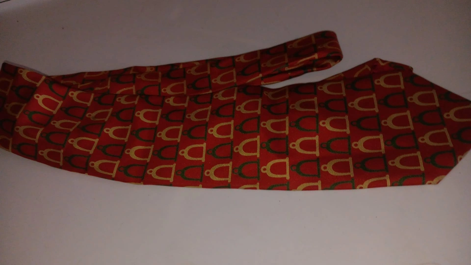 Men's silk necktie. Red background. Repeating gold and green horsebit pattern. Classic design. Great addition to any wardrobe. never used