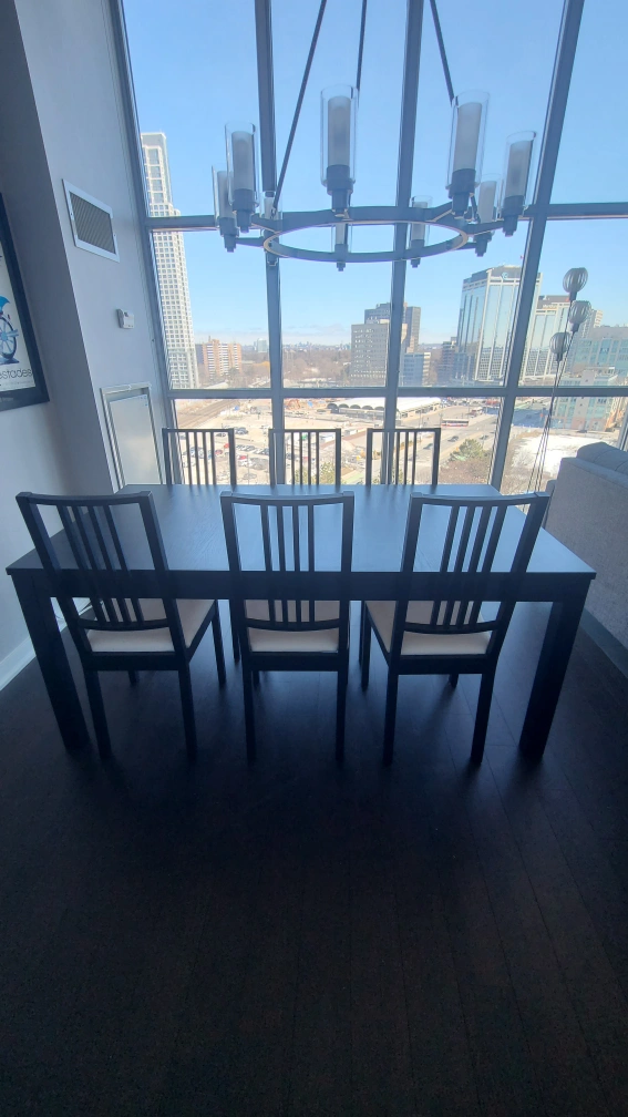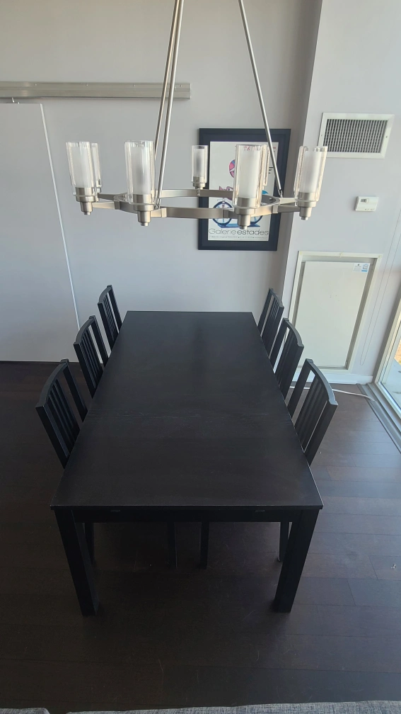 IKEA Dark brown/black extendable dining table. Six black chairs included. Simple, modern design. Table extends to seat more people. Must pickup.