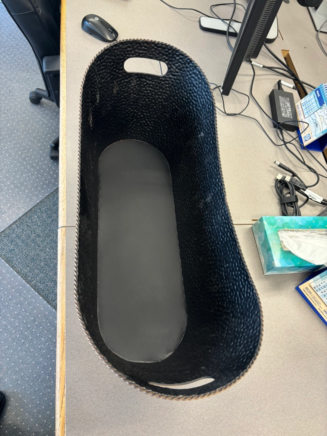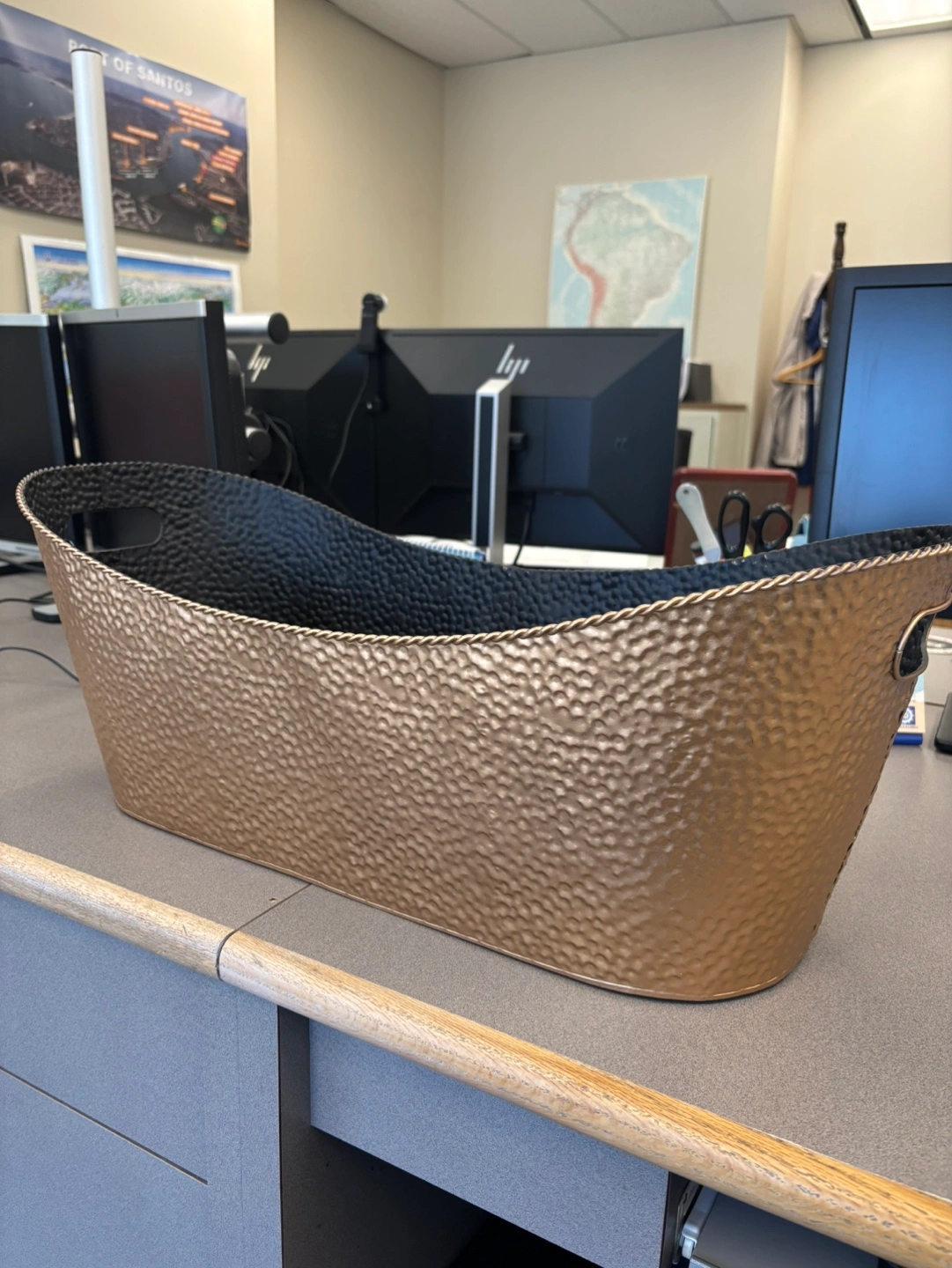 Large decorative container. Copper on the outside and black finish inside. Hammered metal texture. Two handles. Suitable for indoor or outdoor use. Great for plants or storage.