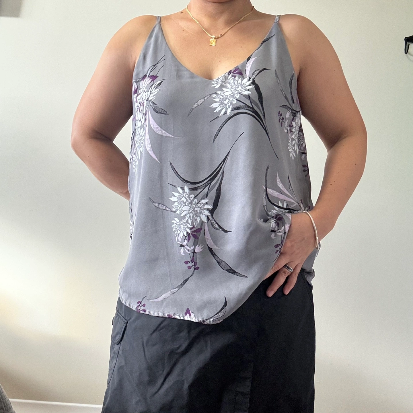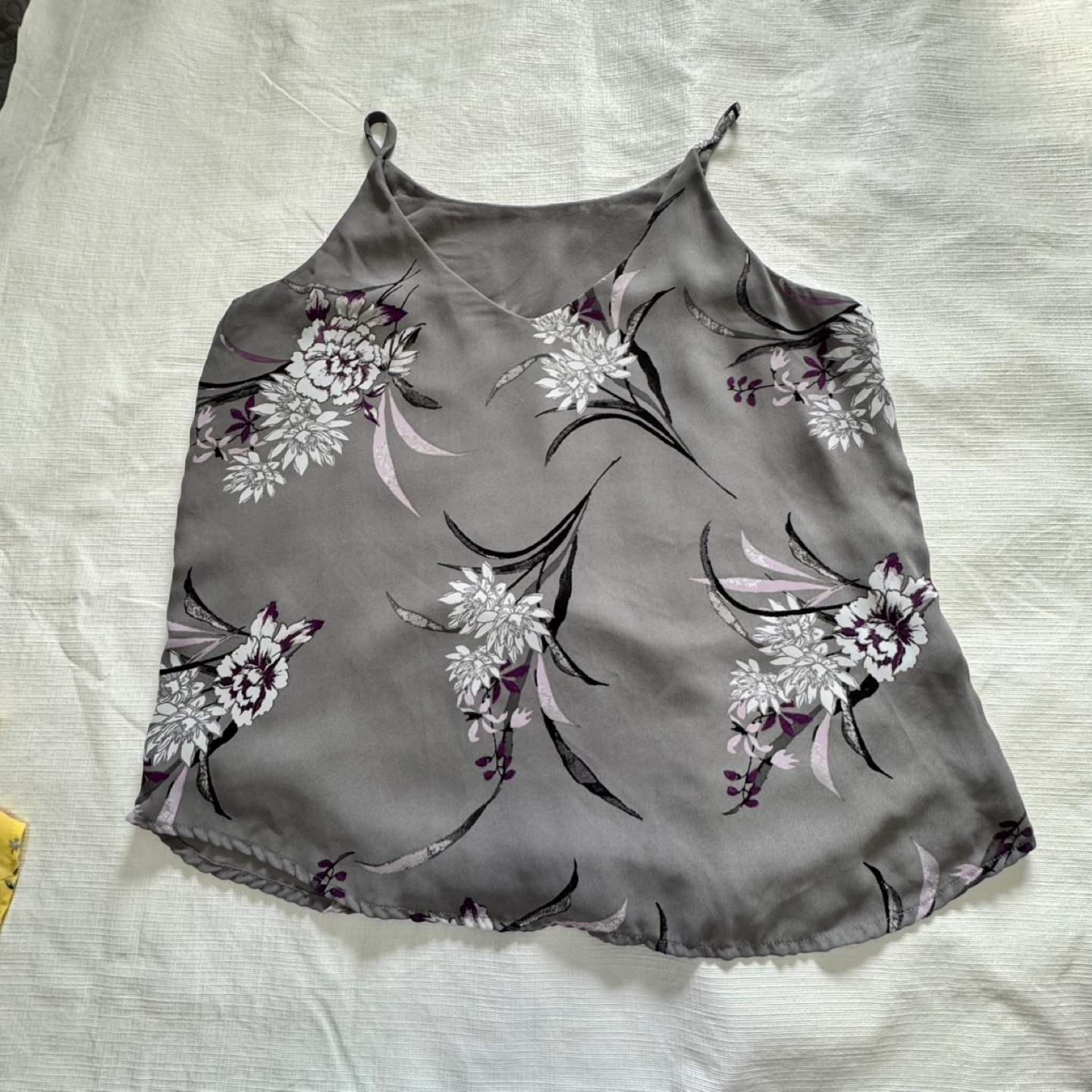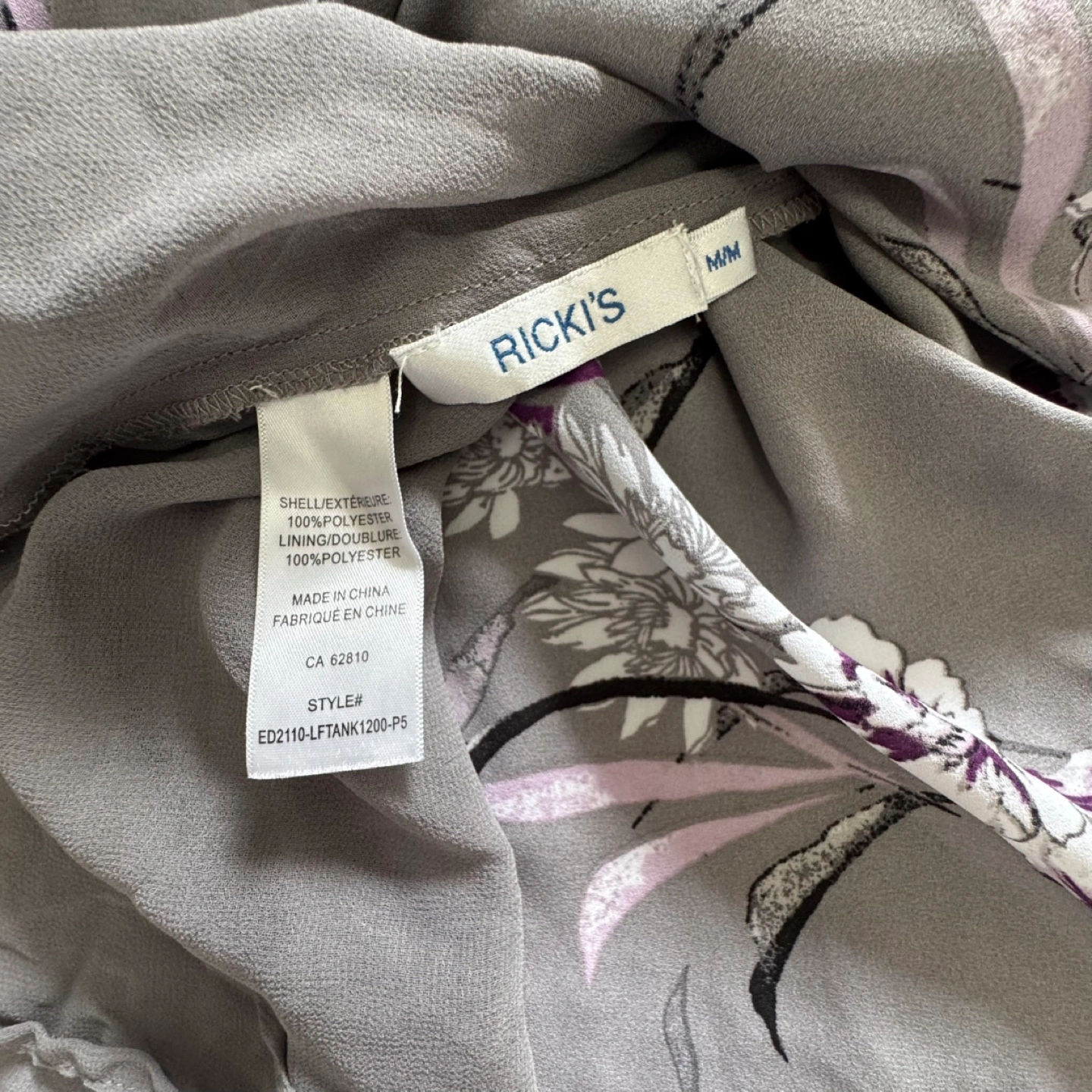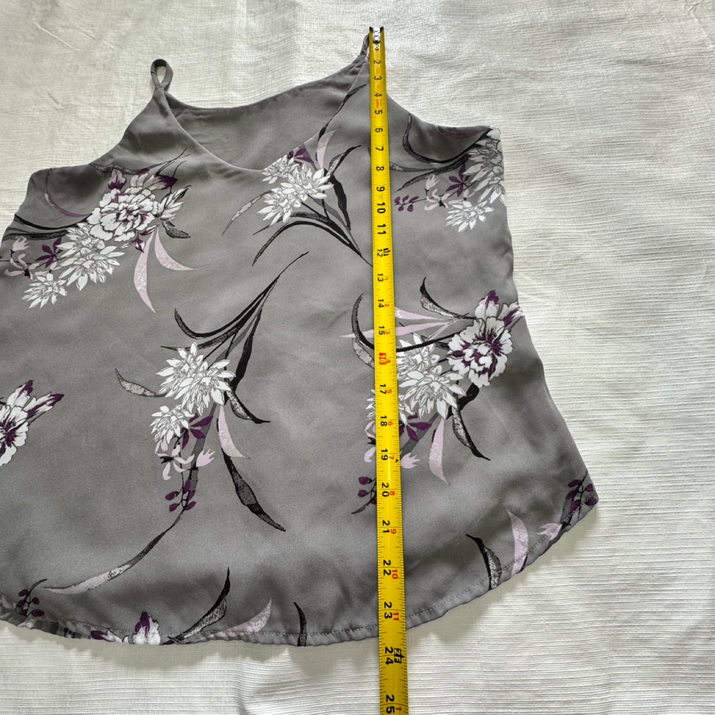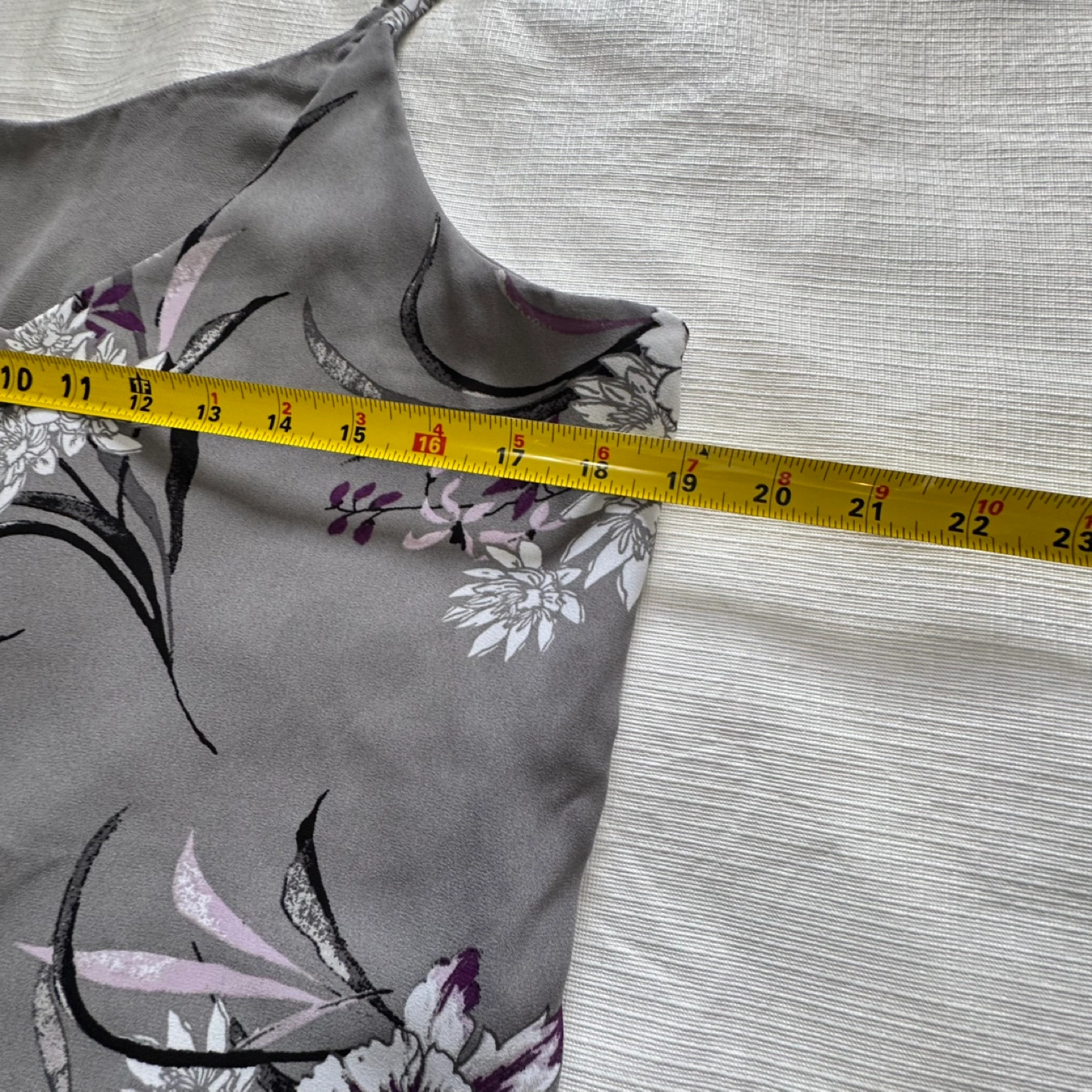 18Flowy grey tank top. Features a floral print in shades of purple and white. Made of 100% polyester. Size Medium.