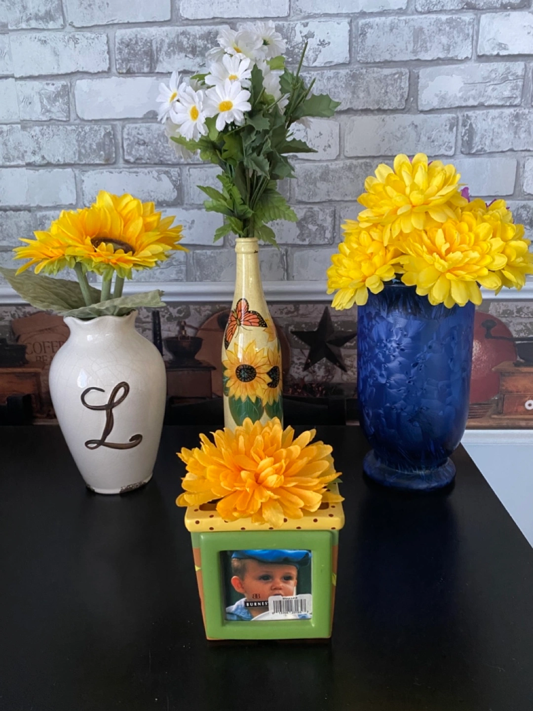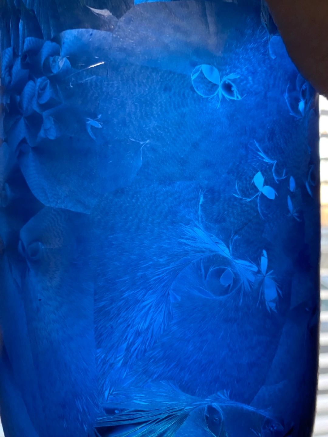 One vase is a tall glass cobalt blue with an etched floral pattern. $5