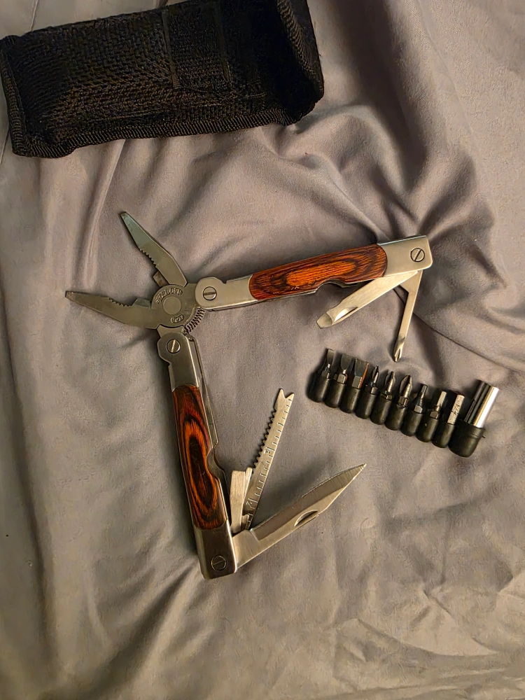 Pocket-sized multi-tool. Features pliers, knife, saw, screwdriver bits, and more. Includes a carrying case.