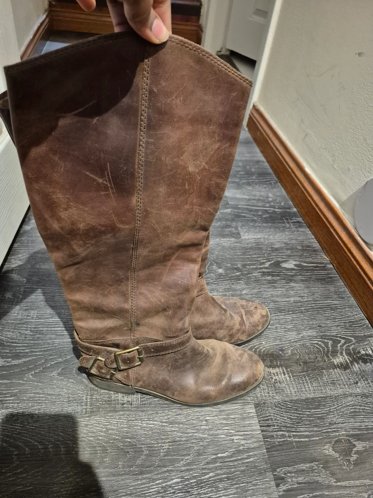 Women's brown leather riding boots, buckle detailed, inner lining needs some care, but great outer leather