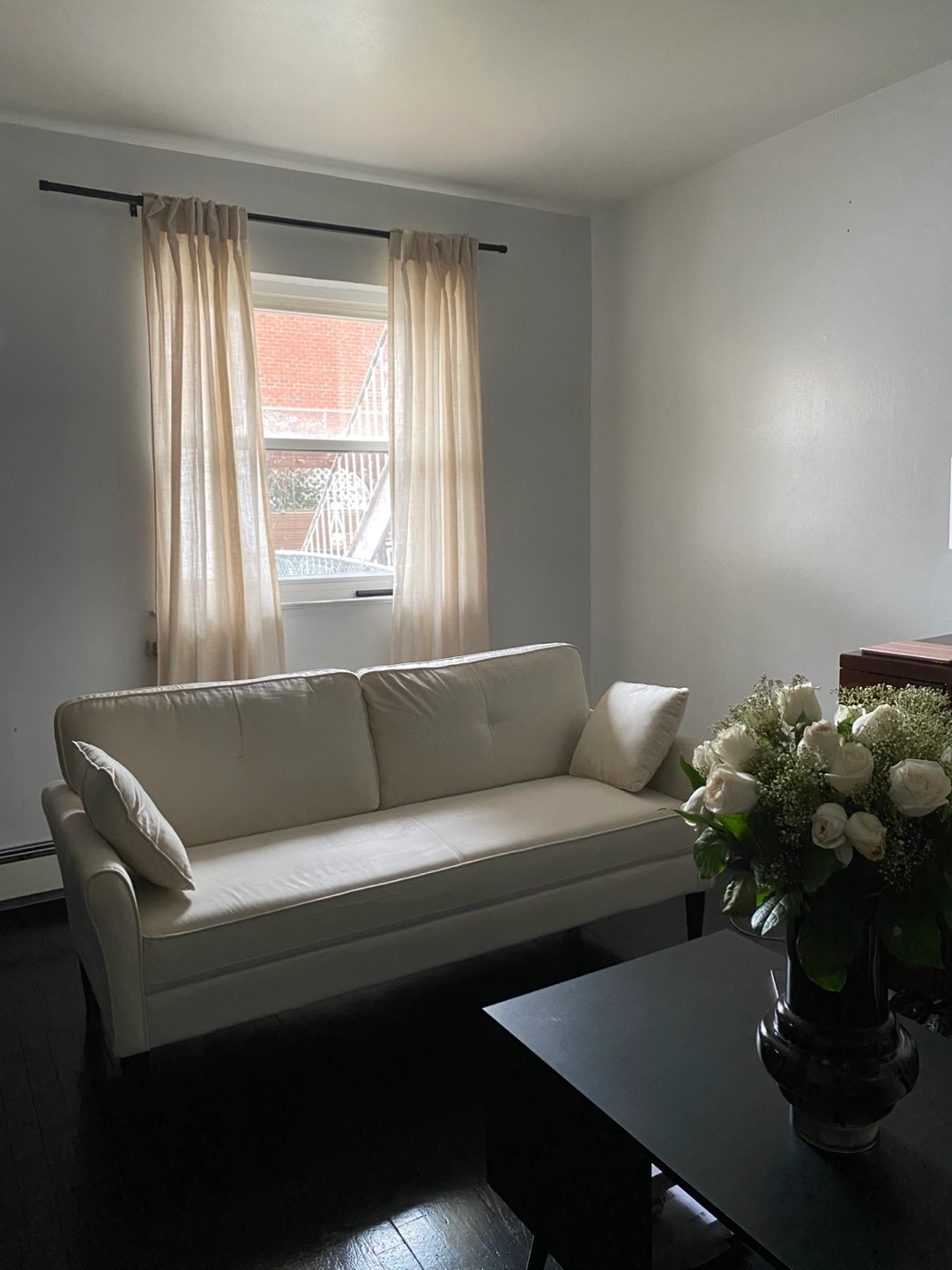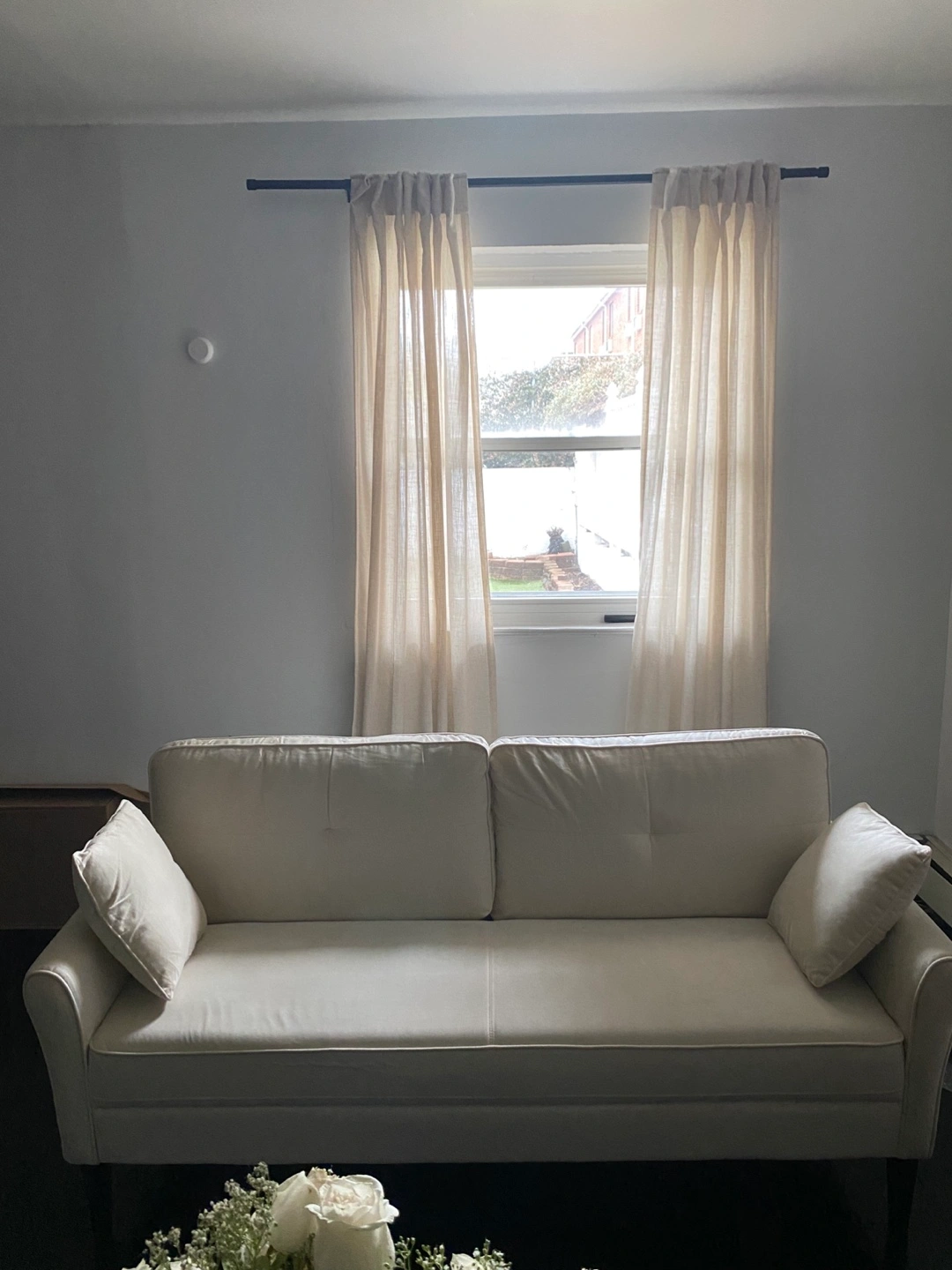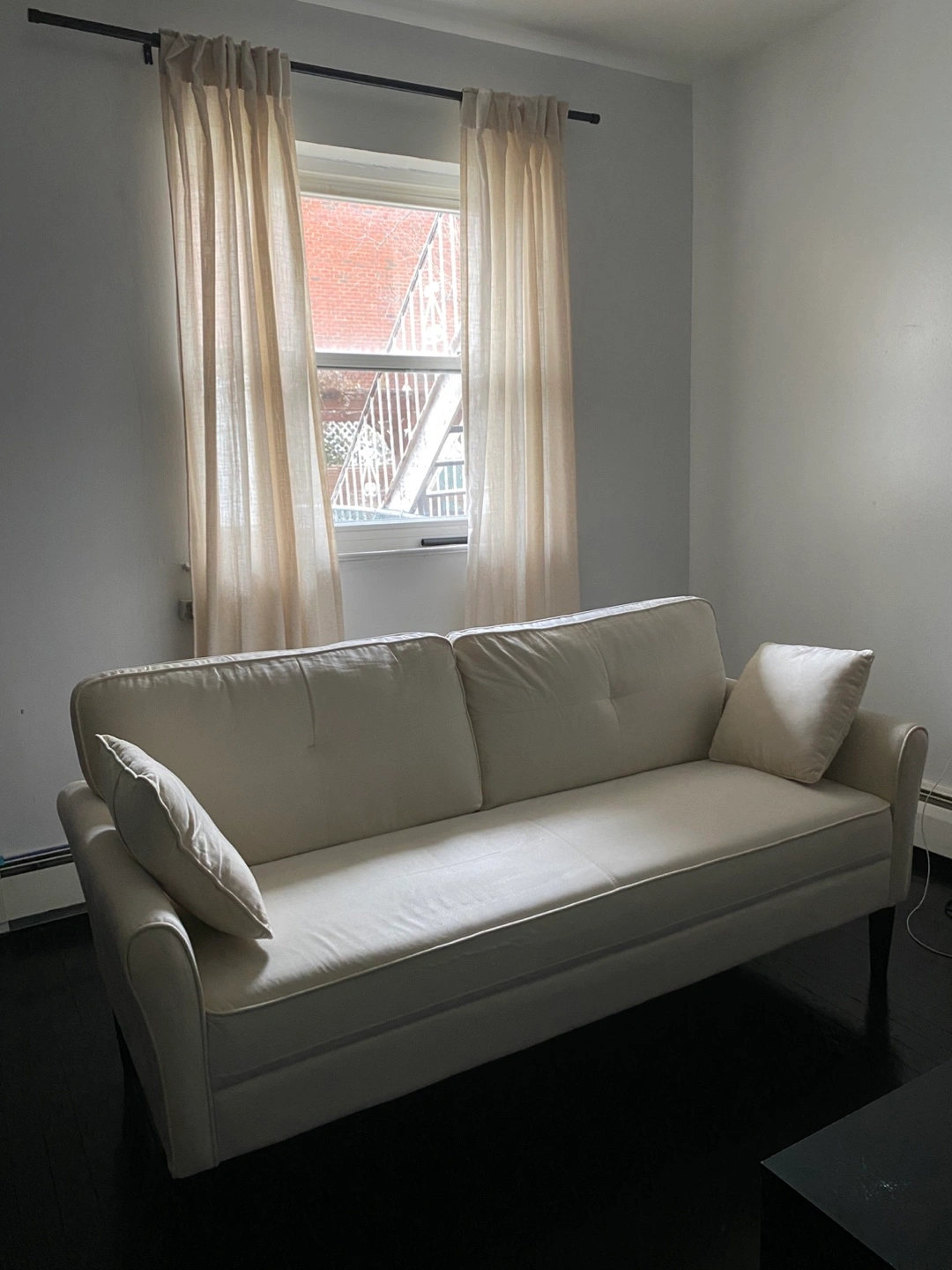 Off-white couch, simple design. Two cushions included. Good condition. Legs are dark wood.