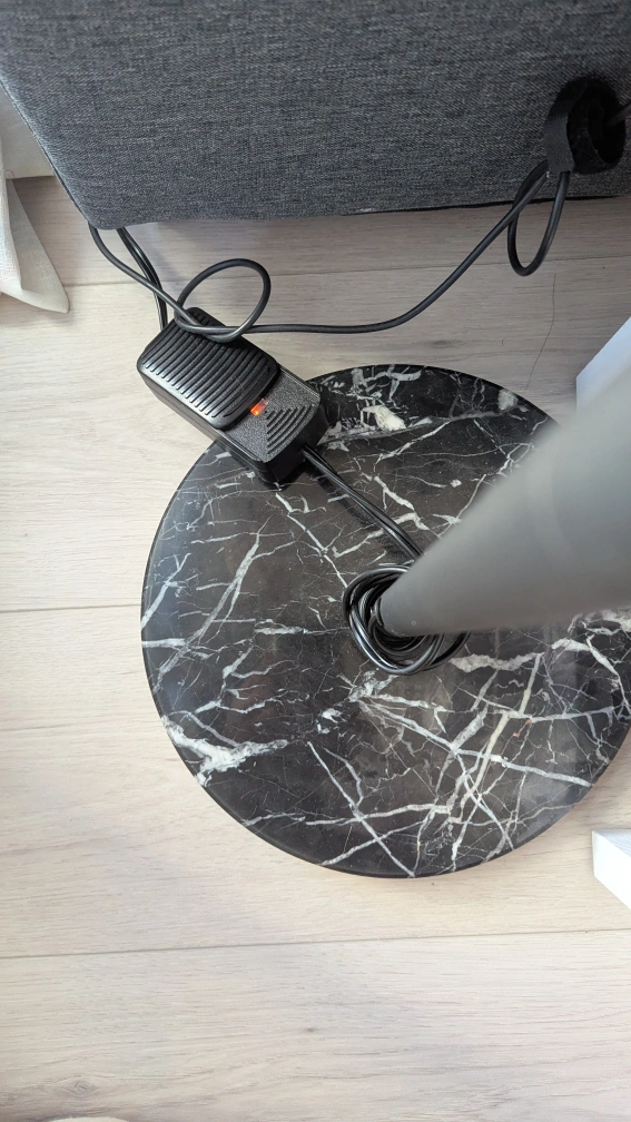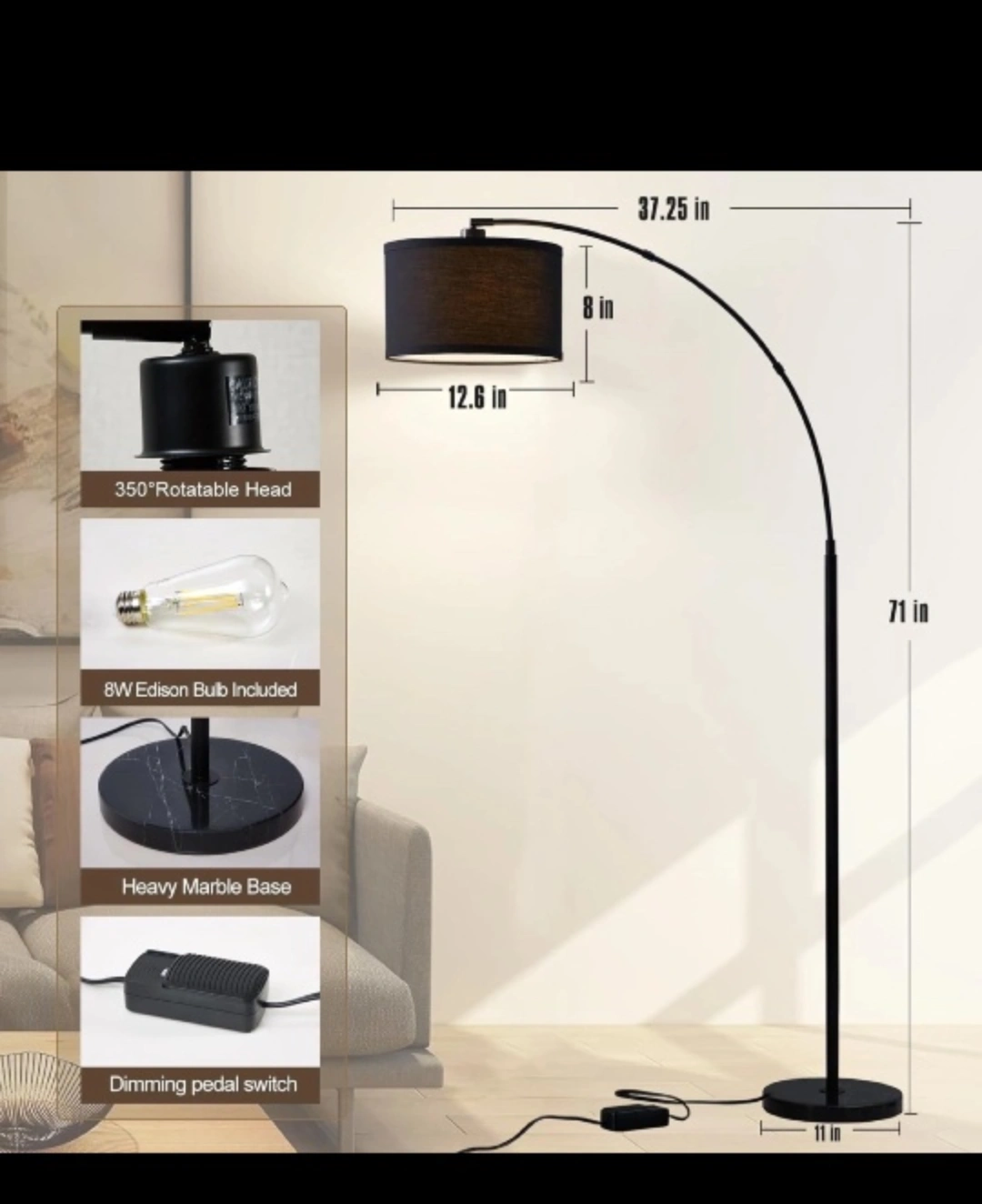 Elegant arc floor lamp. Features a heavy marble base for stability and a dimmable foot switch for convenient control. Dark grey fabric shade. Includes 8W Edison bulb.