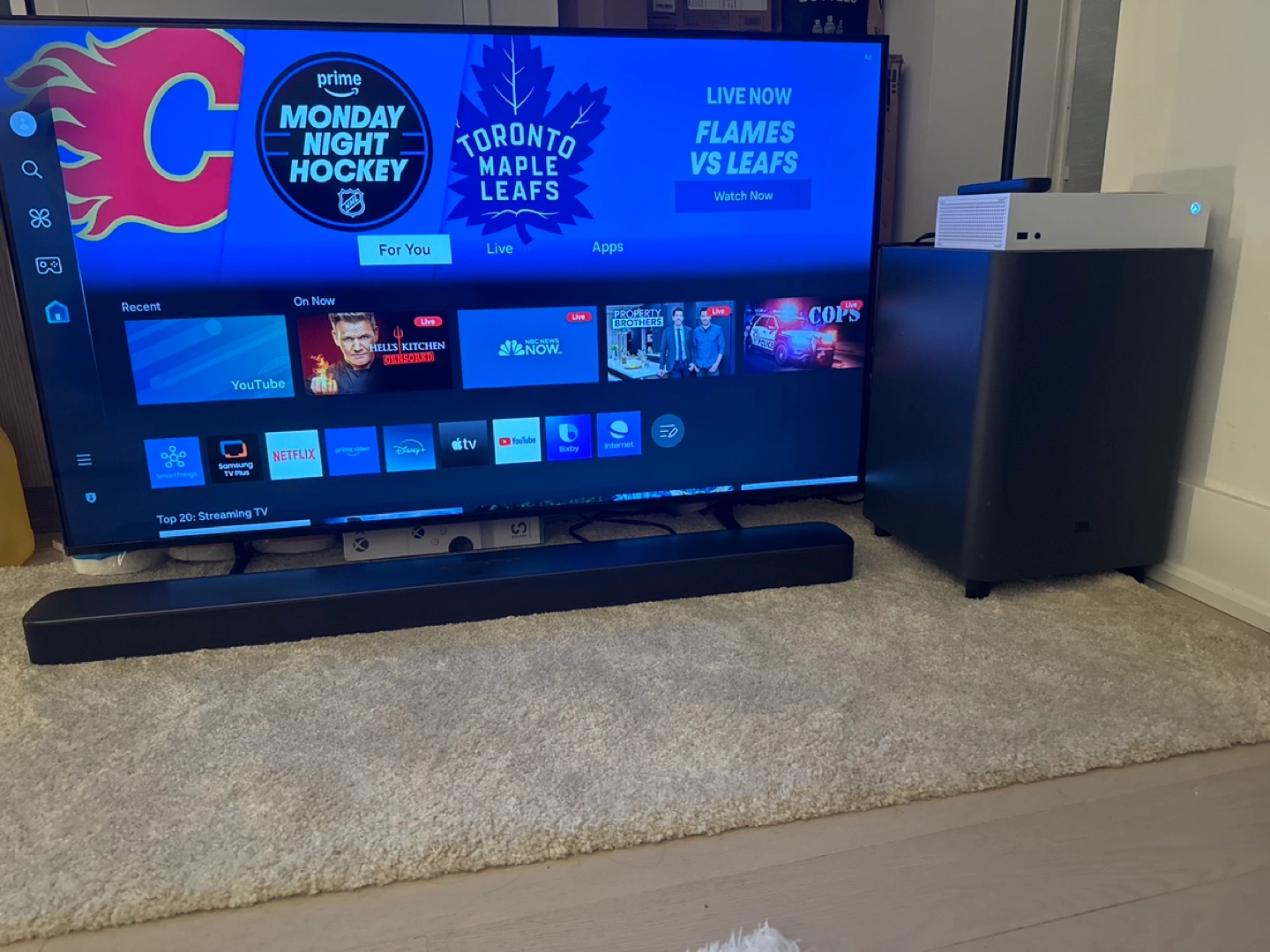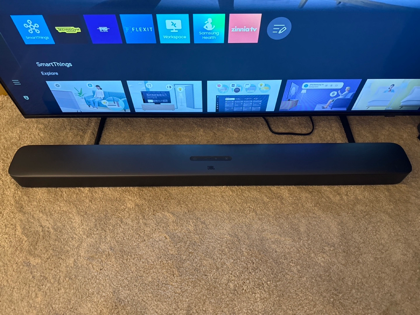 Complete 5.1 home theatre system. Includes soundbar, subwoofer, and remote. Great sound quality. Wireless subwoofer. Easy setup.