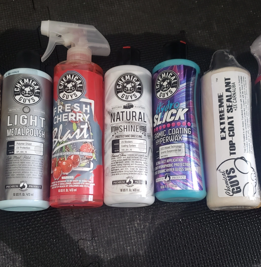 Five Chemical Guys car care products. Includes Light Metal Polish, Fresh Cherry Blast, Natural Shine, Hydro Slick, and Extreme Top Coat Sealant. Detailing products