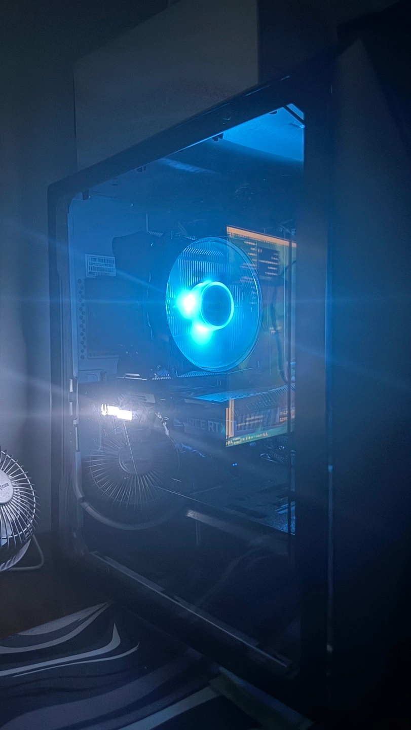 High-performance gaming computer. Features a tempered glass side panel, showcasing internal components. Includes CPU cooler with blue LED lighting. Excellent for gaming and other demanding tasks.