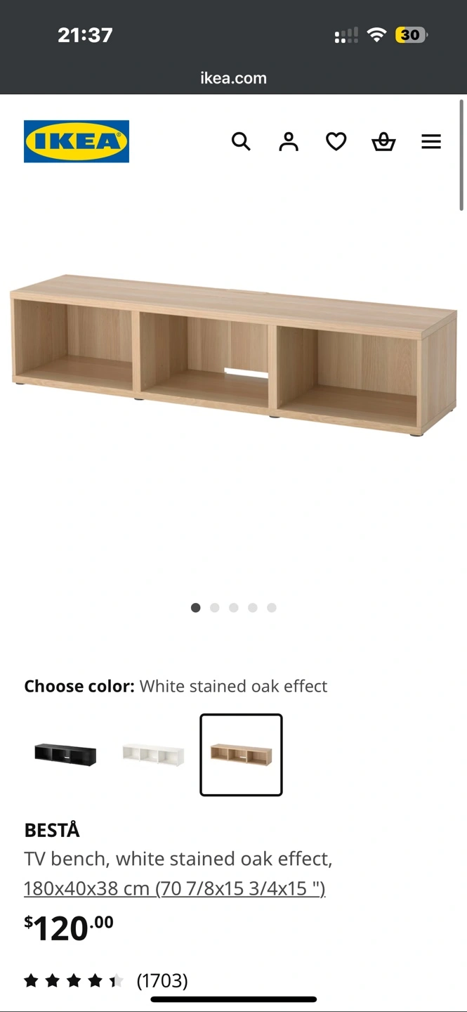 IKEA BESTÅ TV bench. White stained oak effect. 180x40x38 cm. Three compartments.