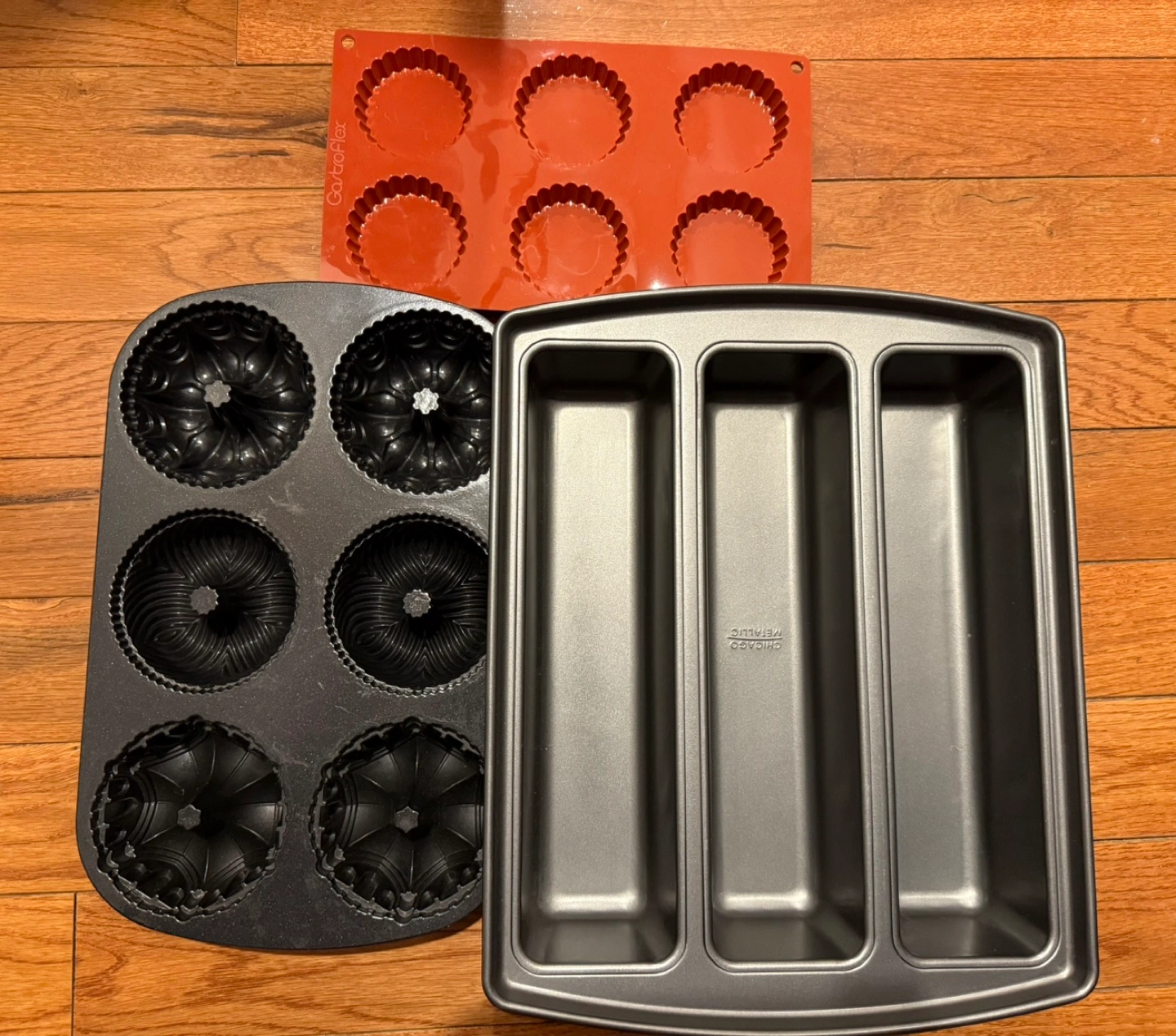 Three baking pans. One silicone mold, six cavities. One metal mold, six cavities. One metal loaf pan, three cavities. Great for cakes, muffins, or breads lasagna