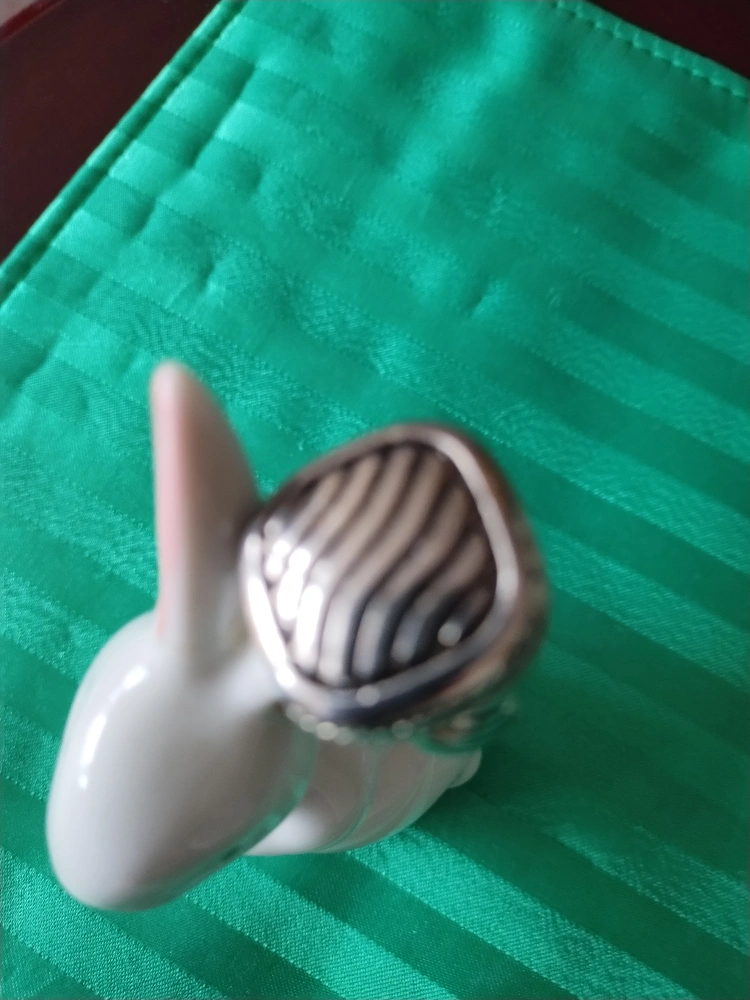 636Unique silver tone ring. Features a textured, patterned face. Wide band.