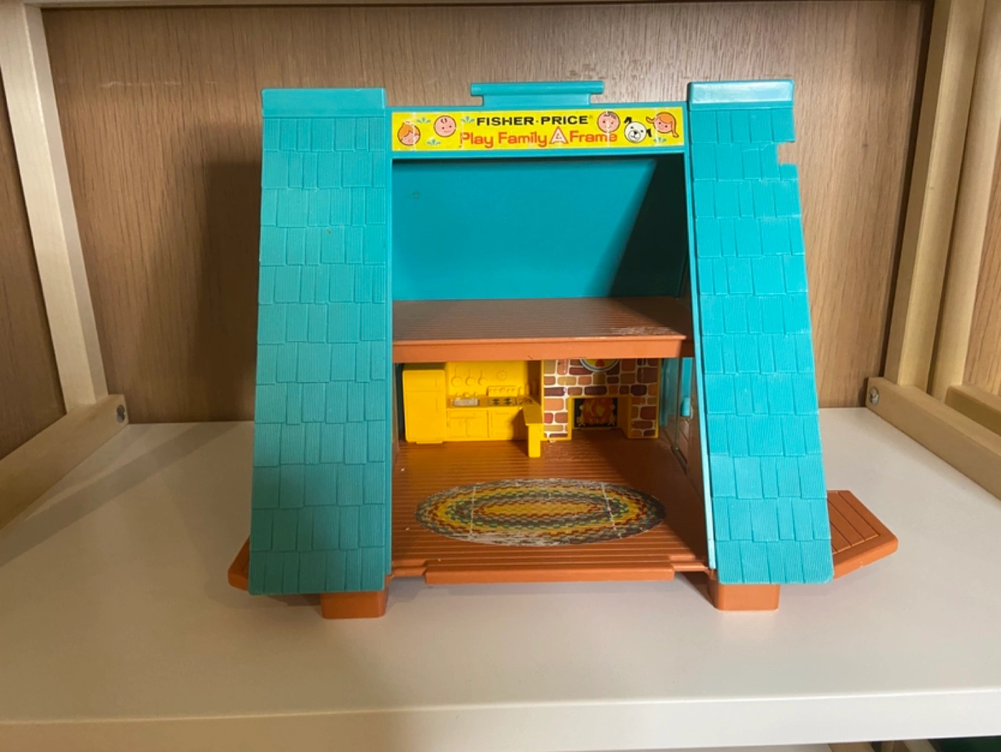 Vintage Fisher-Price Play Family A-Frame house. Teal and orange. Two floors. Includes kitchen and fireplace. Honestly I wish I could live here!