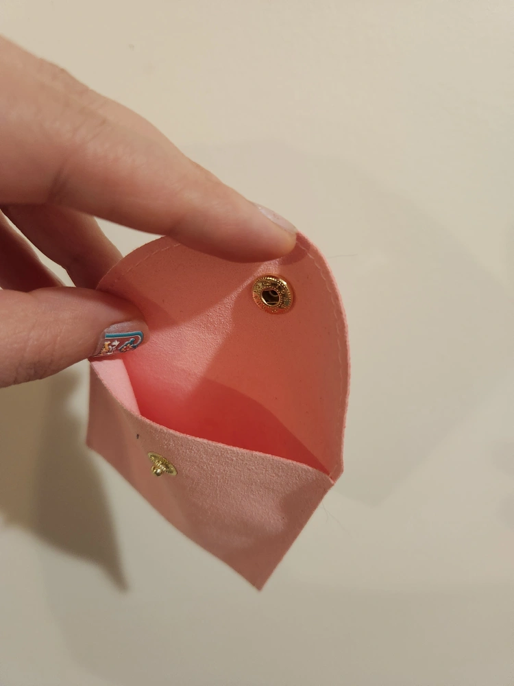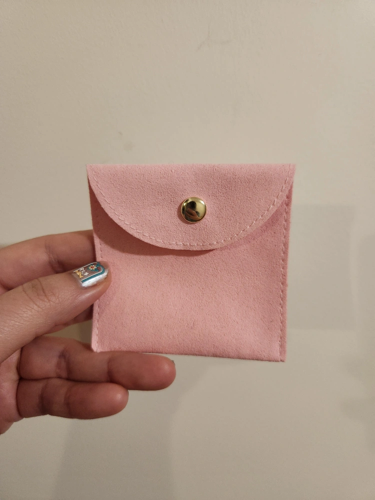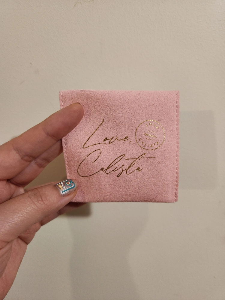 Pink jewellery pouch. Small size, perfect for earrings or a necklace. Snap button closure with suede-like texture. "Love Calista" printed on the front