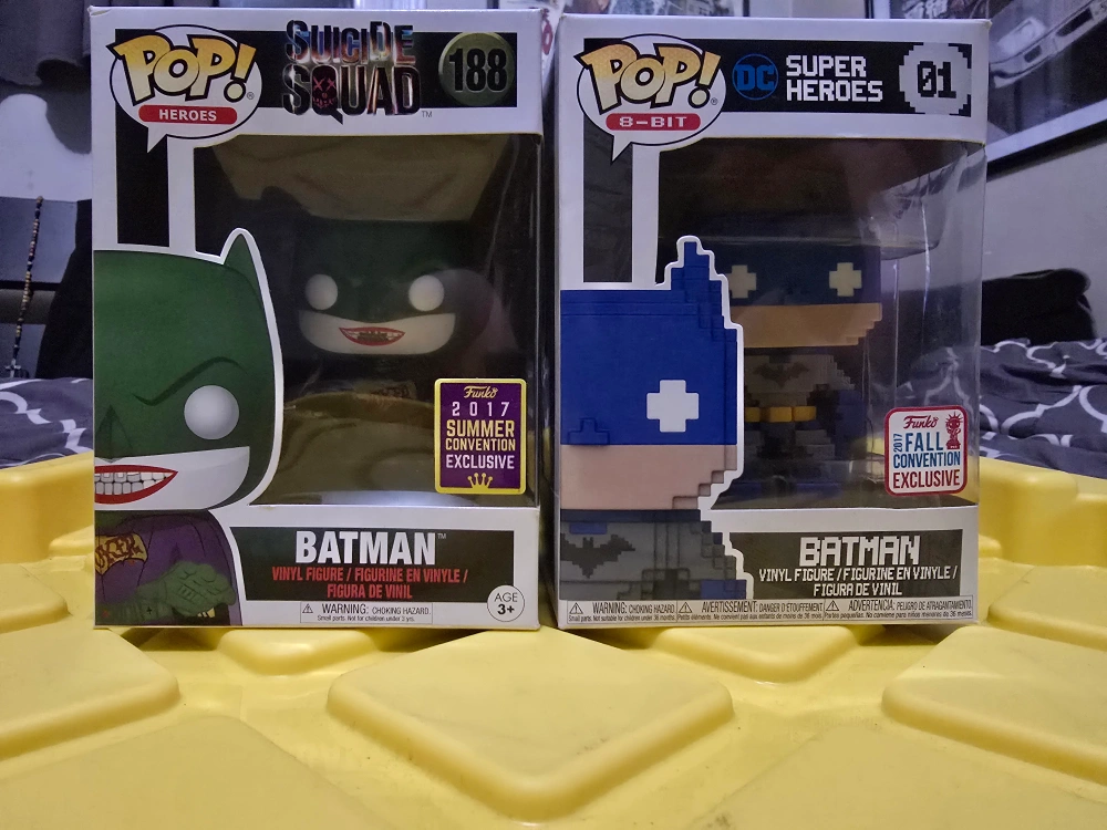 Two Batman Funko Pop! vinyl figures. One is a Summer Convention exclusive and the other a Fall Convention exclusive. Both are in their original boxes.