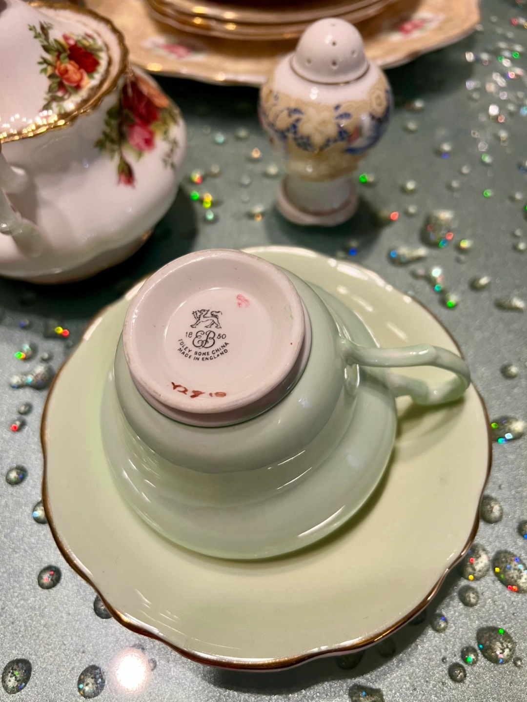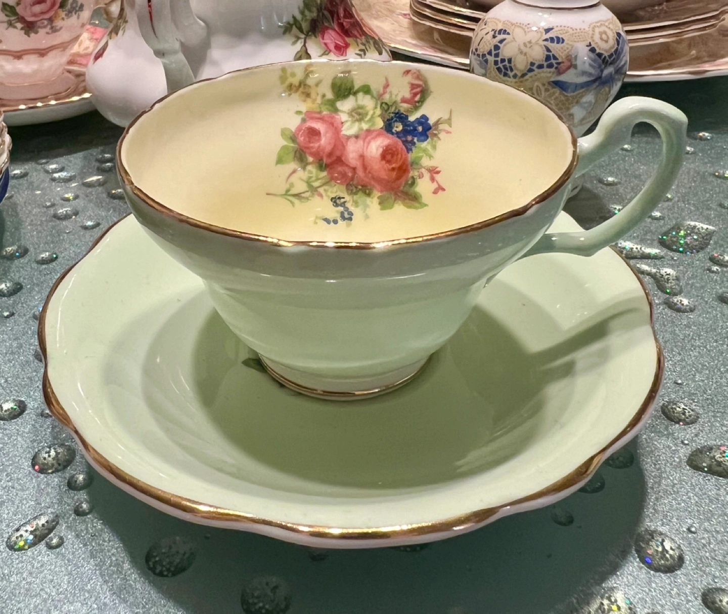 Pretty vintage teacup and saucer. Pale green colour. Gold trim. Floral design.