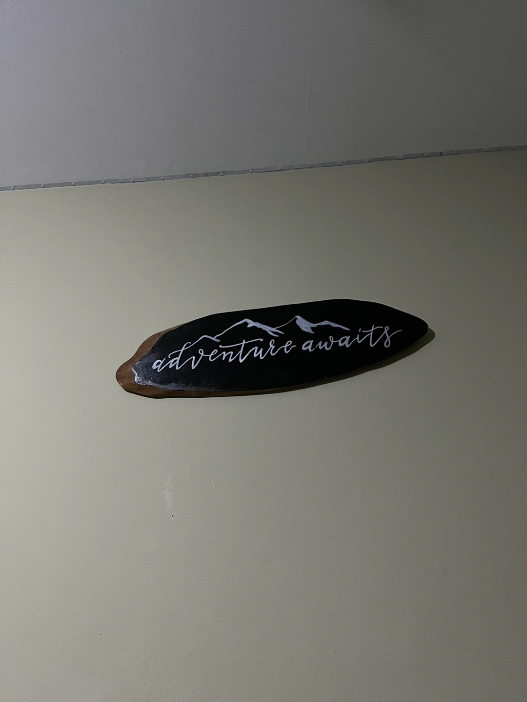 Black wood sign. Features white lettering: "Adventure awaits." Mountain range graphic included. Perfect for home decor.