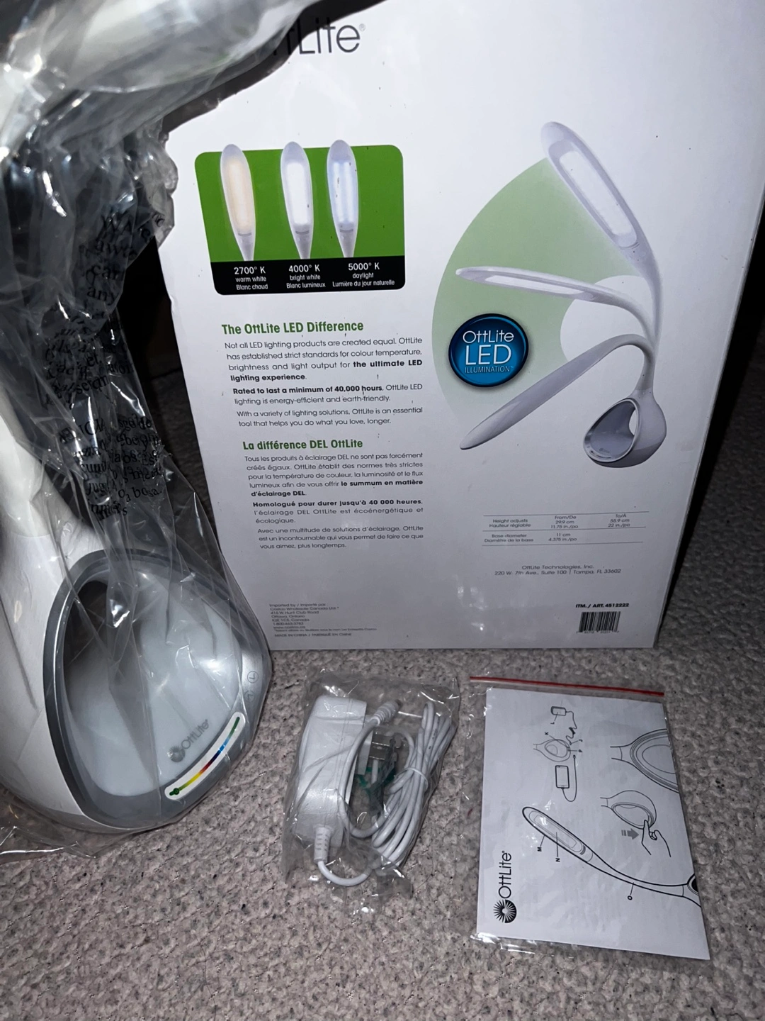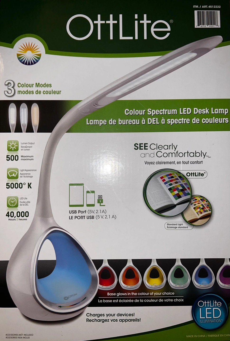 Brand New OttLite LED desk lamp. Colour changing base. Includes USB port for charging devices. Comes with power adapter and instructions. Energy efficient LED. Able to deliver if needed!
