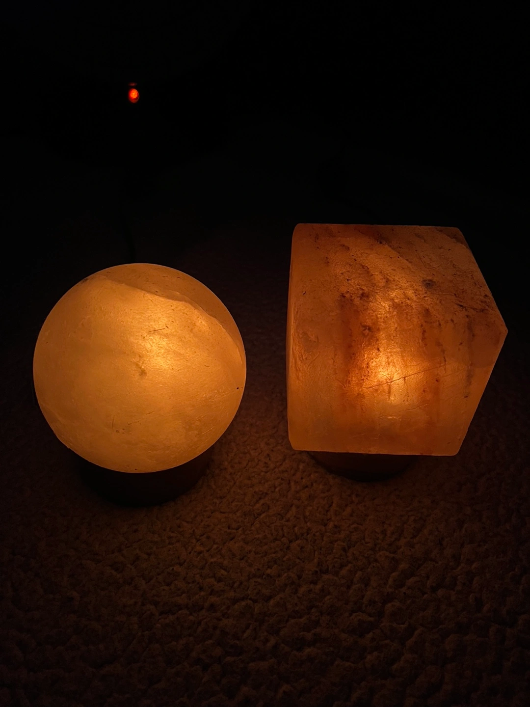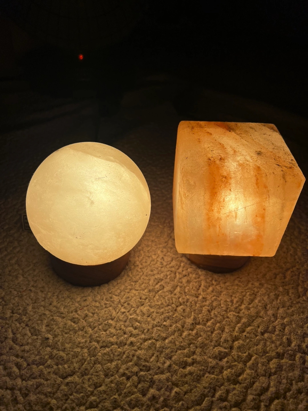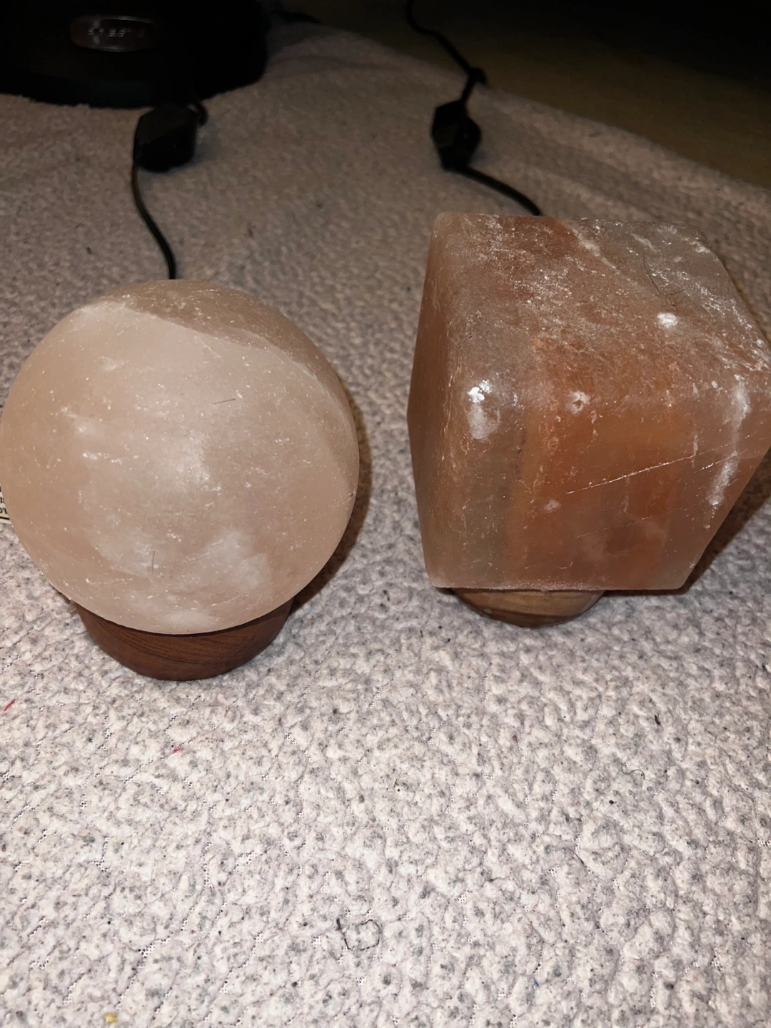 Two Himalayan salt lamps. One sphere, one cube. Wooden bases. Great for ambiance. Pre-owned, good condition.