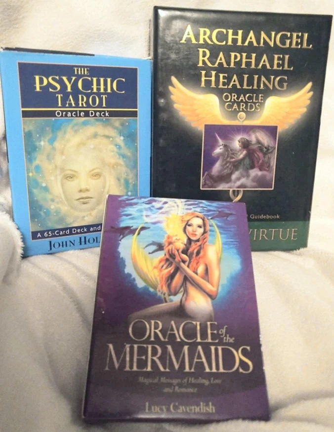 Collection of three oracle card decks. Psychic Tarot oracle deck by John Holland. Archangel Raphael Healing oracle cards. Oracle of the Mermaids by Lucy Cavendish.