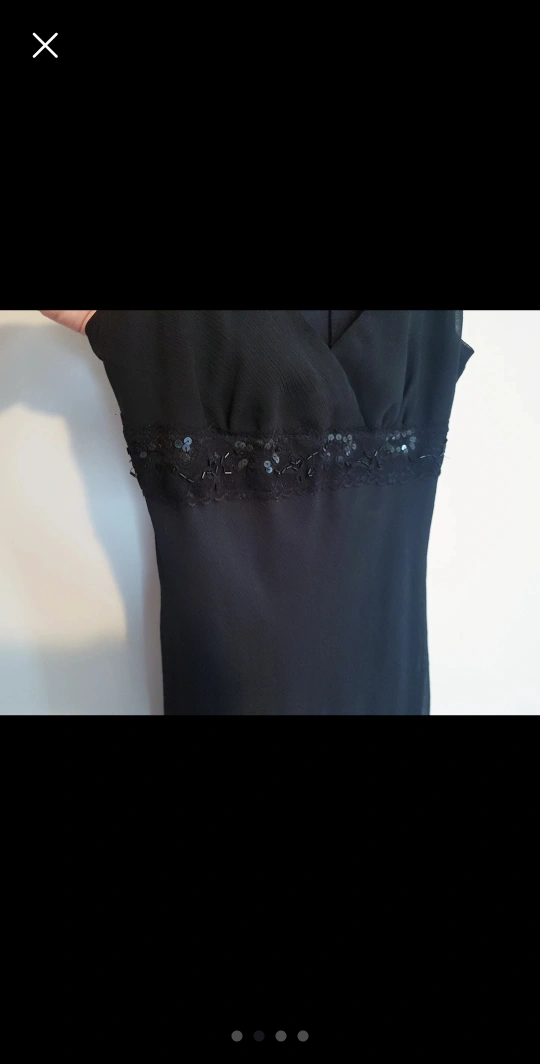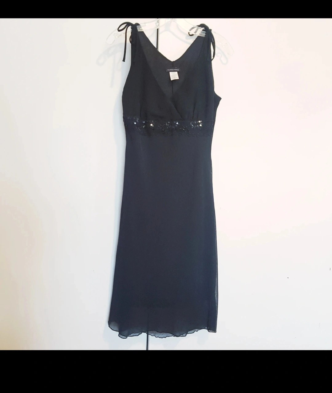 Fairweather, Black, sleeveless, crossover midi dress. V-neckline. Sequins and lace detail at empire waist. Shoulder ties. Flowy fabric. . Light and sheer with solid black slip. Great condition- worn once.