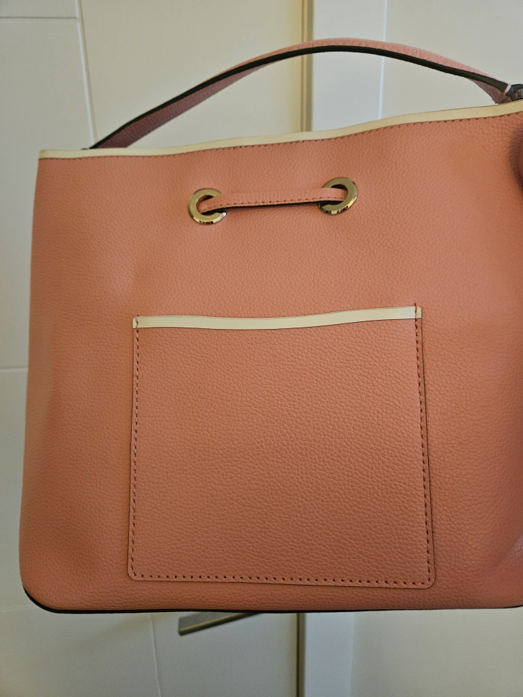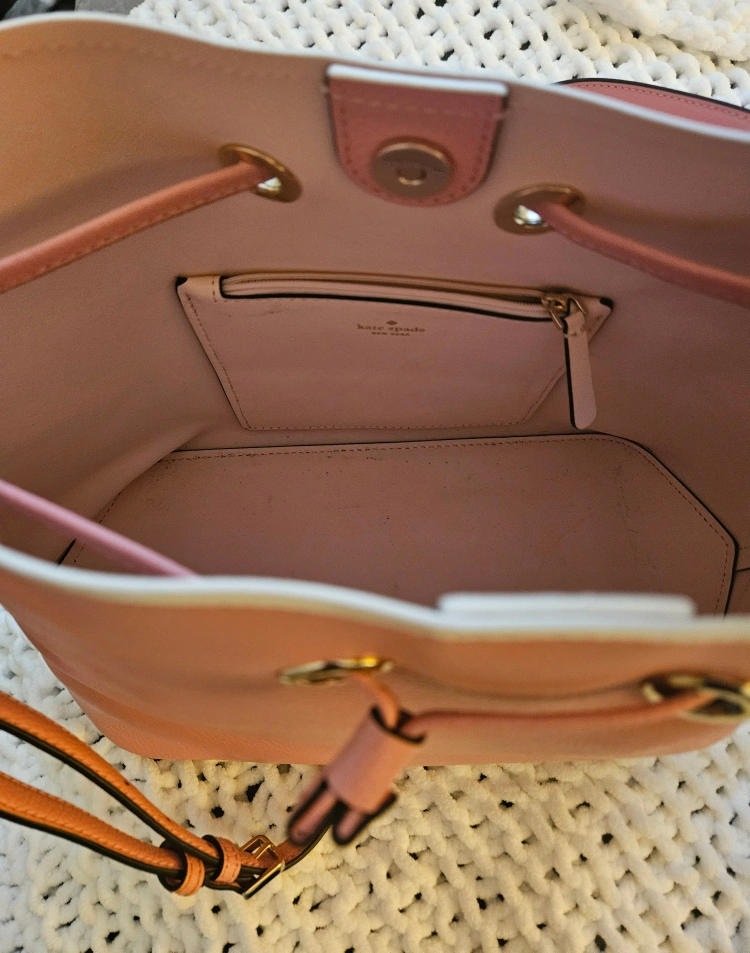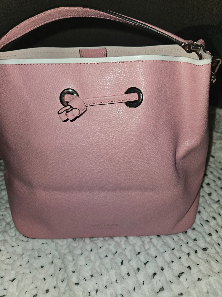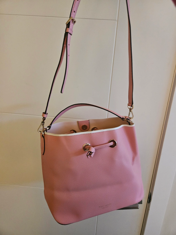 Adorable pink bucket bag. Features a drawstring closure, an adjustable strap, and a small interior pocket. Gold-toned hardware accents. Excellent condition.