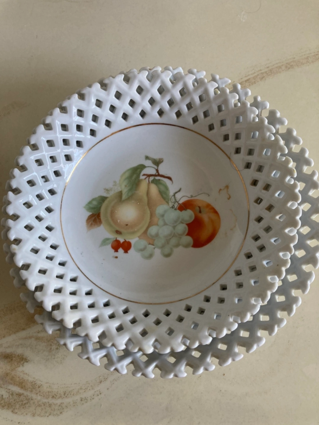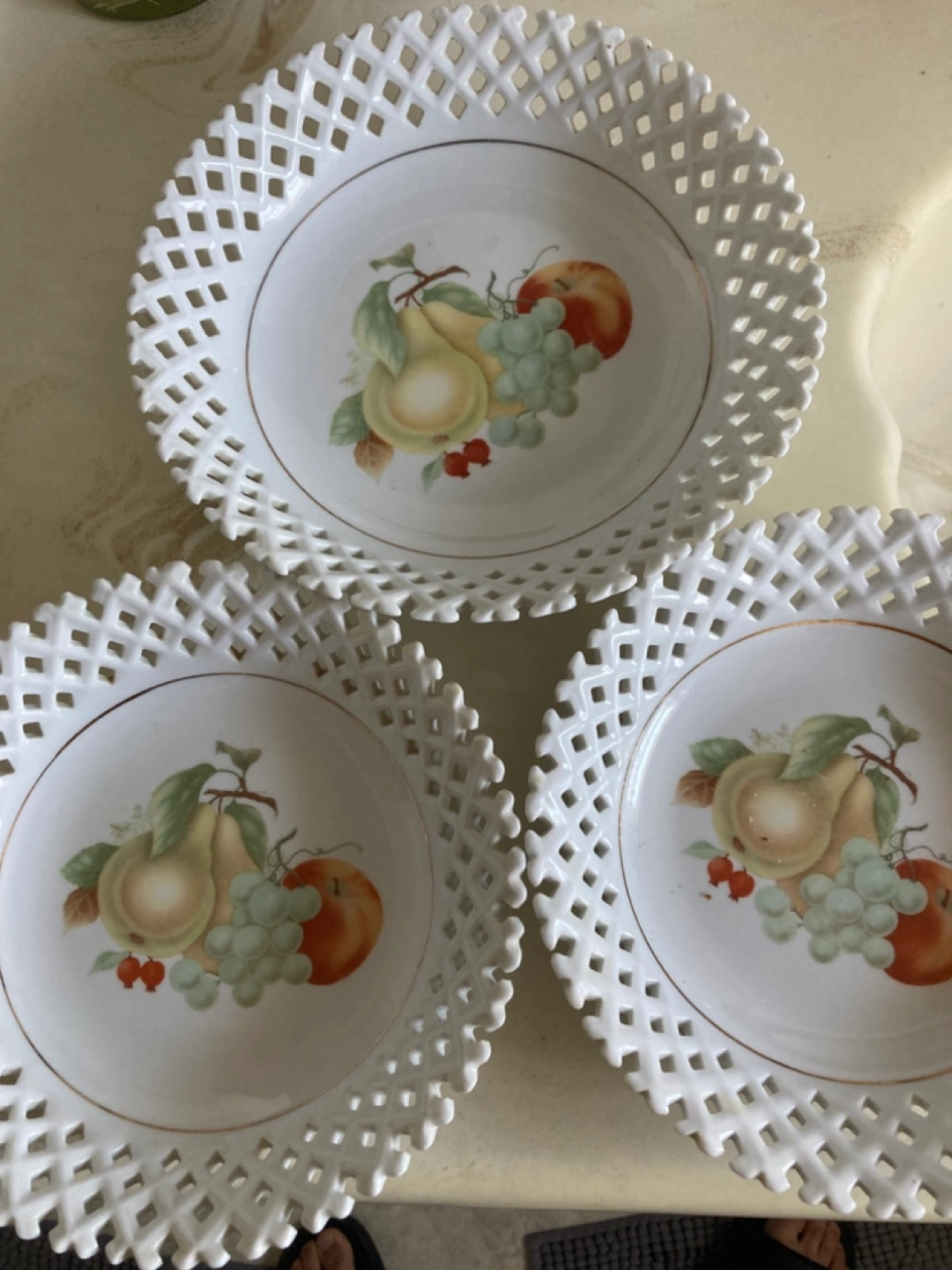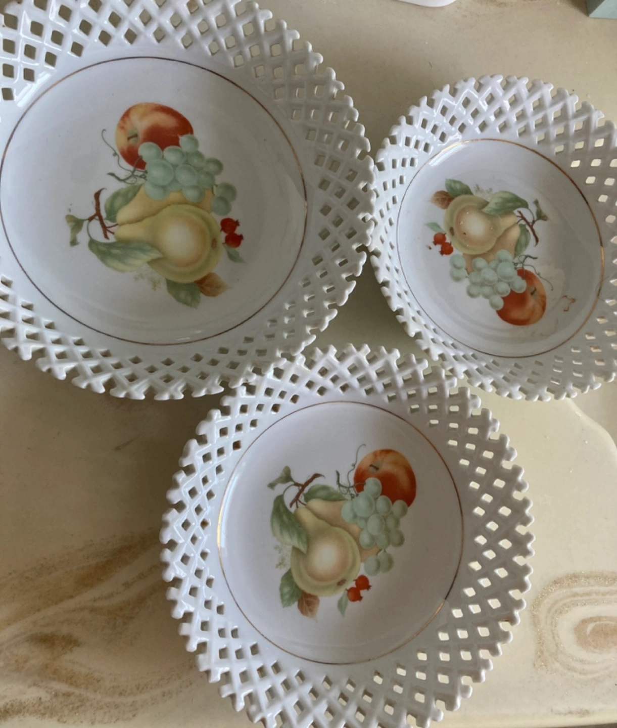 Set of three vintage porcelain bowls. Lattice design. Fruit painting. Gold trim. Perfect for serving or display.