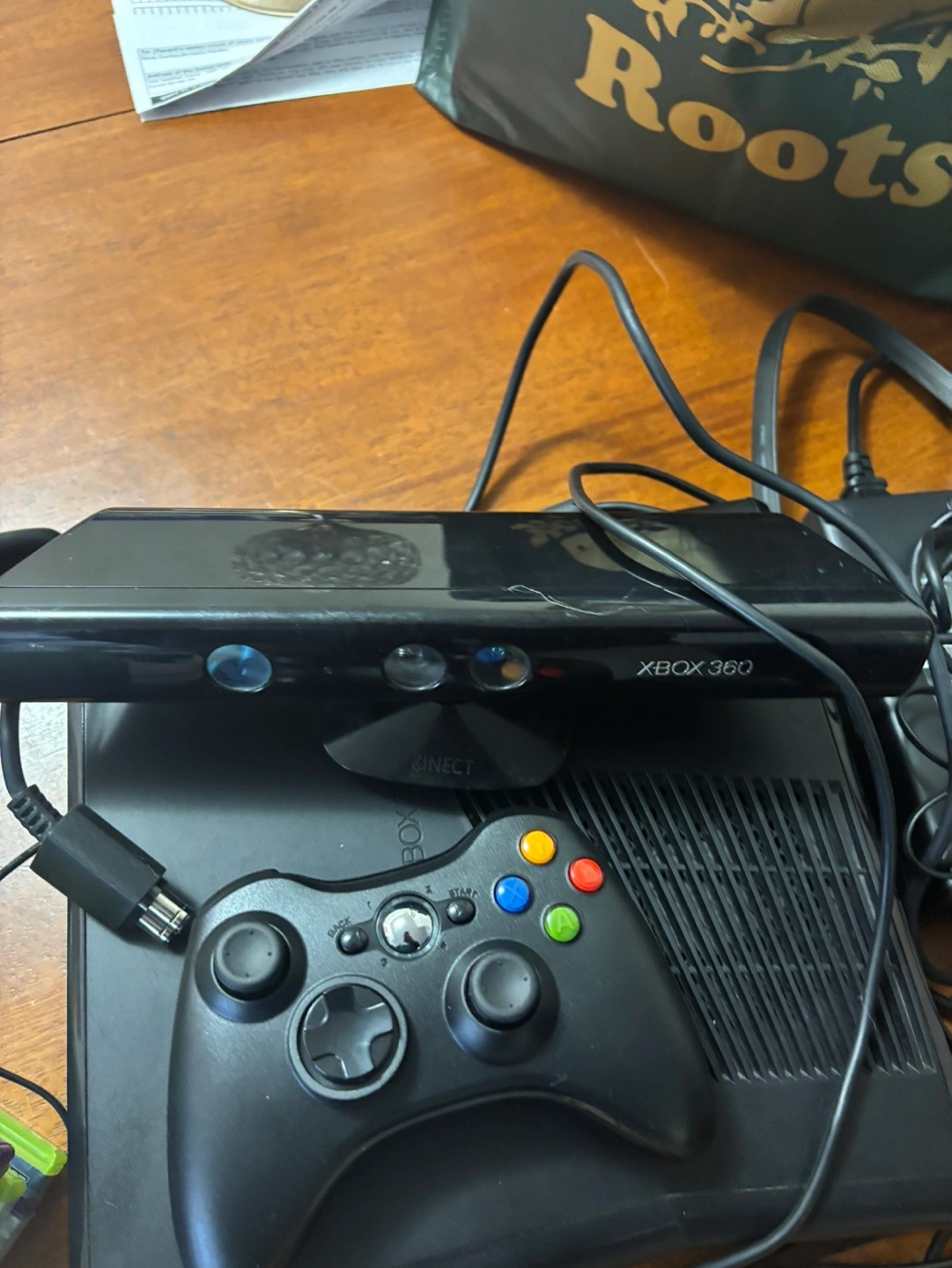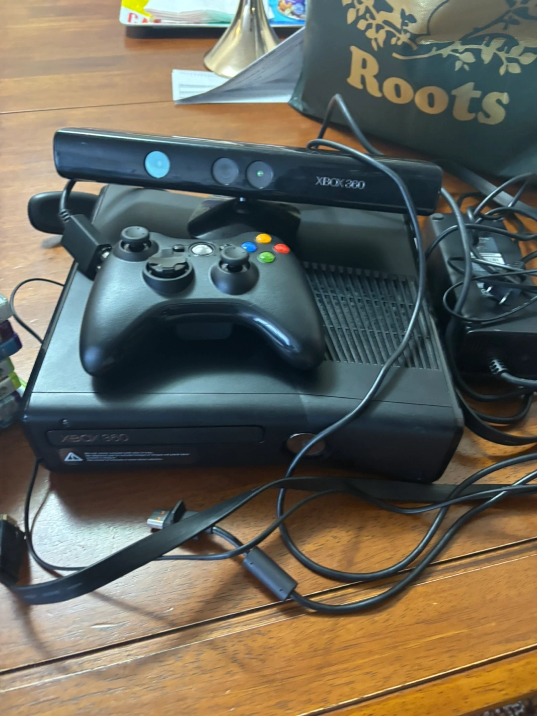 Xbox 360 console, Kinect sensor, one controller, power supply, and several games included. Pre-owned, some wear and tear.